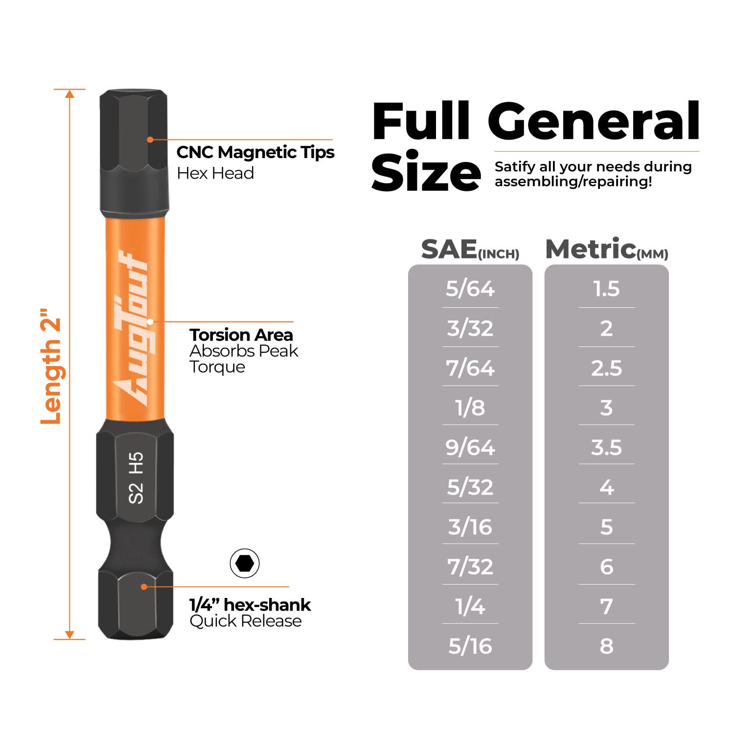 - 20pcs hex bits set. 10pcs SAE-5/64”,3/32”, 7/64”, 1/8”, 9/64”, 5/32”, 3/16”, 7/32”, 1/4”, 5/16”. 10pcs metric-1.5mm, 2mm, 2.5mm, 3mm, 3.5mm, 4mm, 5mm, 6mm, 7mm, 8mm. 1/4” quick release hex-shank, 2” long.