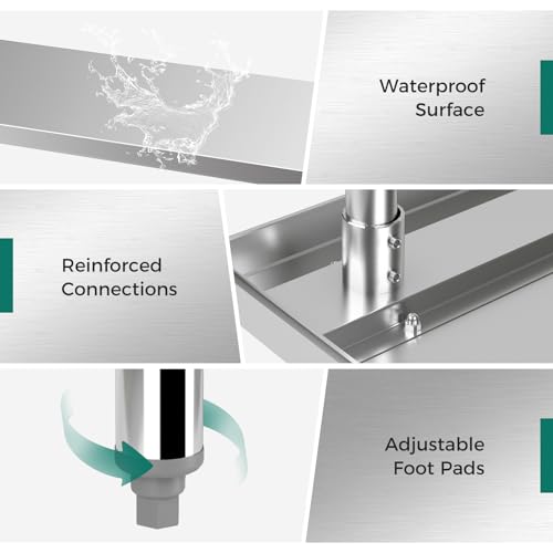 - 【 Adjustable Height 】 Equipped with a galvanized steel under shelf and four galvanized steel legs, our stainless steel table can withstand indoor or outdoor elements for a long time use. Furthermore, you can adjust the height of under shelf and leg feet according to your various needs, making it perfect for use in any commercial spaces.