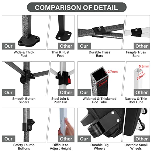 - 【UPGRADED Framework】High quality powder coated aluminum frame brings incredible strength to this heavy duty pop up canopy,at the same time rust and corrosion resistant. The newly upgraded 32mm steel tube diameter & 0.7mm wall thickness have significantly improved strength compared to other tents on the market and help to provide strong support, can carry up to 11 people at the same time. With sandbags and wind ropes,it can be stable in winds of 50 km/h.