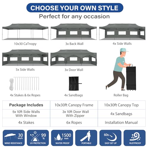 Tooluck 10x30 Pop up Heavy Duty Canopy with 8 sidewalls, Waterproof Commercial Pop up Party Tent Canopy,Outdoor Tents for Wedding Parties, 3 heigh Adjustable Gazebo with Wheeled Bag,Grey