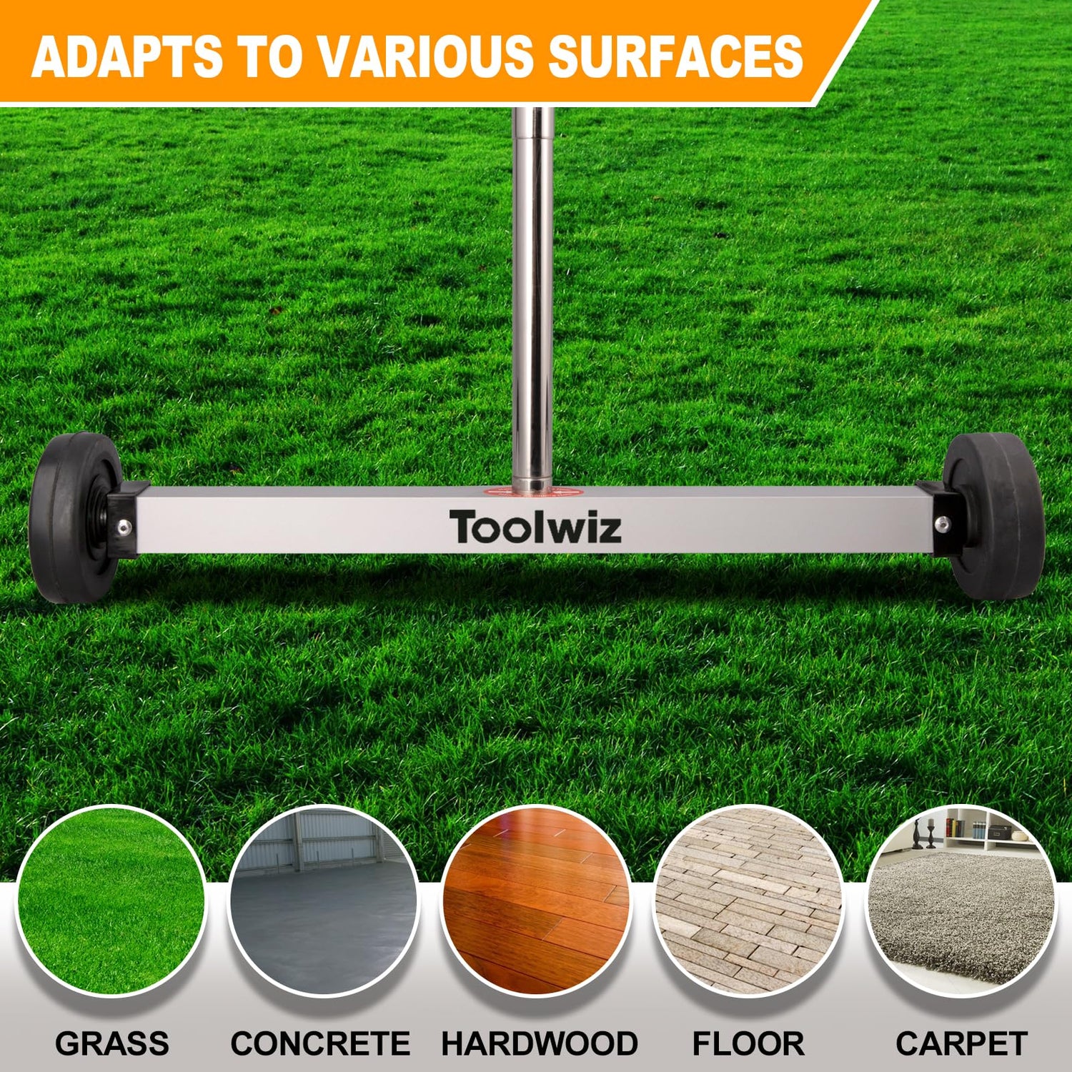 Toolwiz Magnetic Pick Up Sweeper 17-inch Heavy Duty Magnet Pickup Lawn Sweeper Roofing Tools, 8.8 Lbs Yard Tools with Telescoping Holder and Wheels to Clean Nails Adjustable Handle for Construction