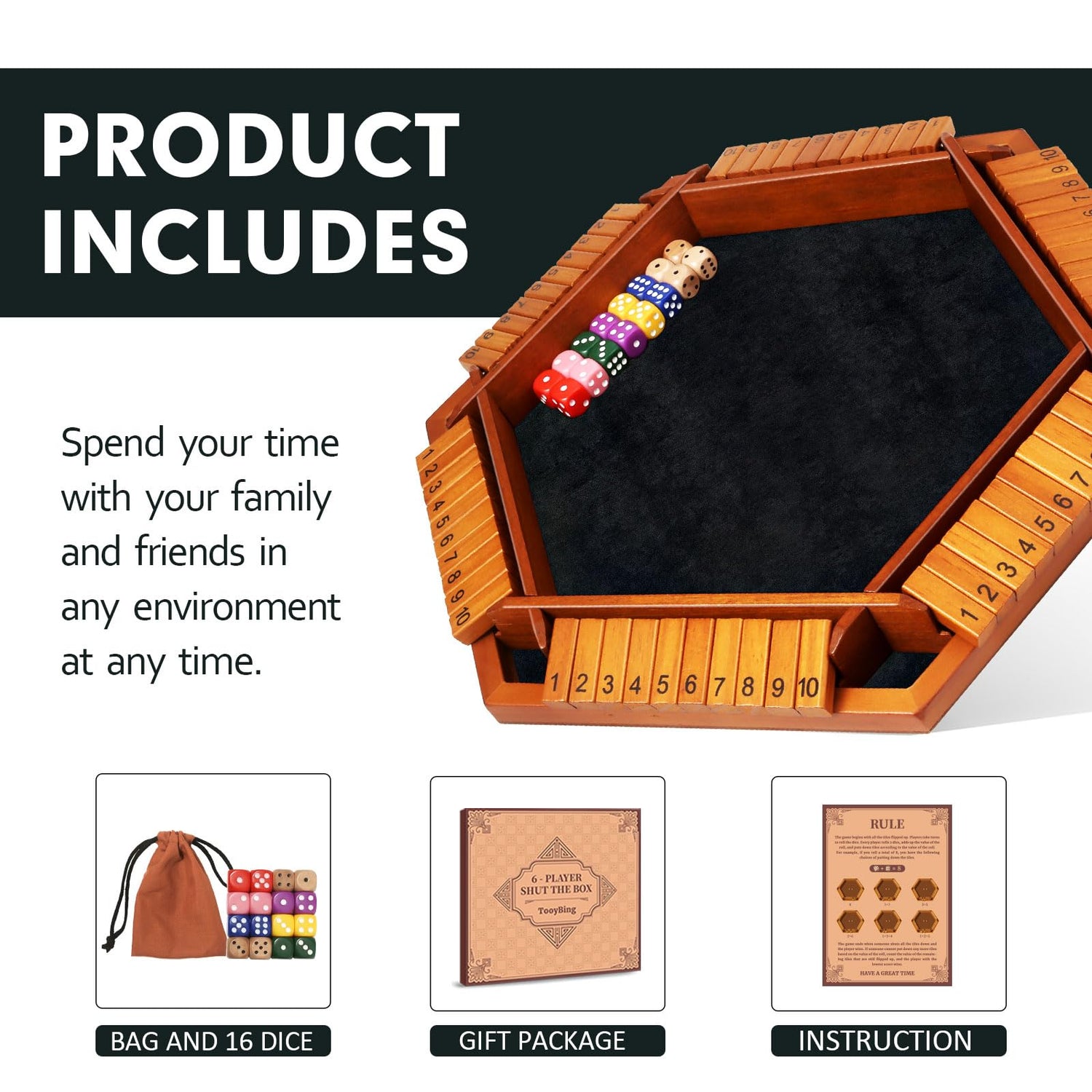 - 6 Players Classic Shut the Box Dice Board Game: The wooden Shut the Box game is a classic traditional board games. TooyBing has improved and now provides this wooden box that can be played by 6 player at the same time. It is equipped with 16 high-quality dice (including 12 colored dice and 4 wood-colored dice), allowing players to play this dice game at the same time. Great board game for teens and kids. Table top board games for 2 3 4 5 6 players.