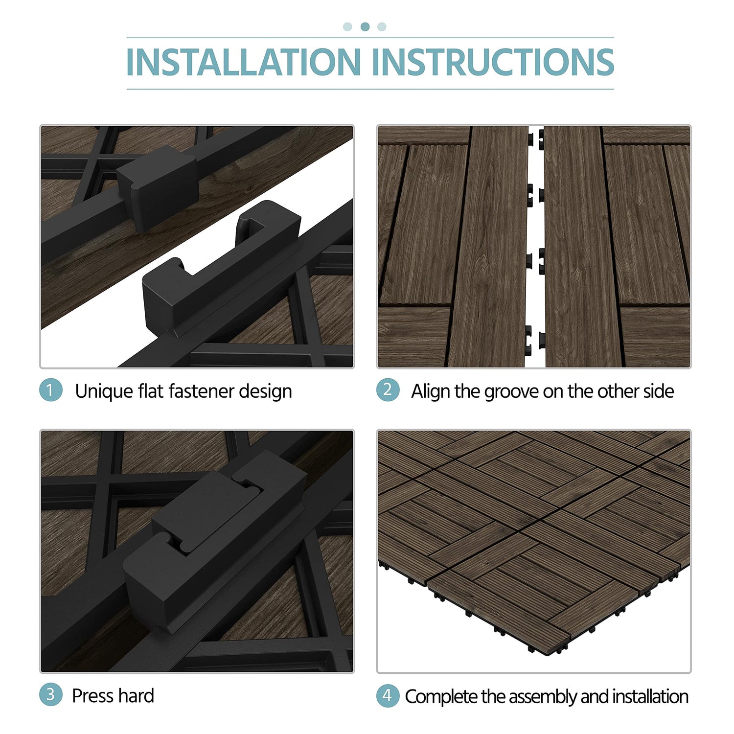- Easy-to Use Interlocking Design: These 27pcs wooden floor tiles have interlocking snaps at the bottom for easy use and better ventilation. The edge of the floor can be spliced freely with buckle and groove to be a continuous piece