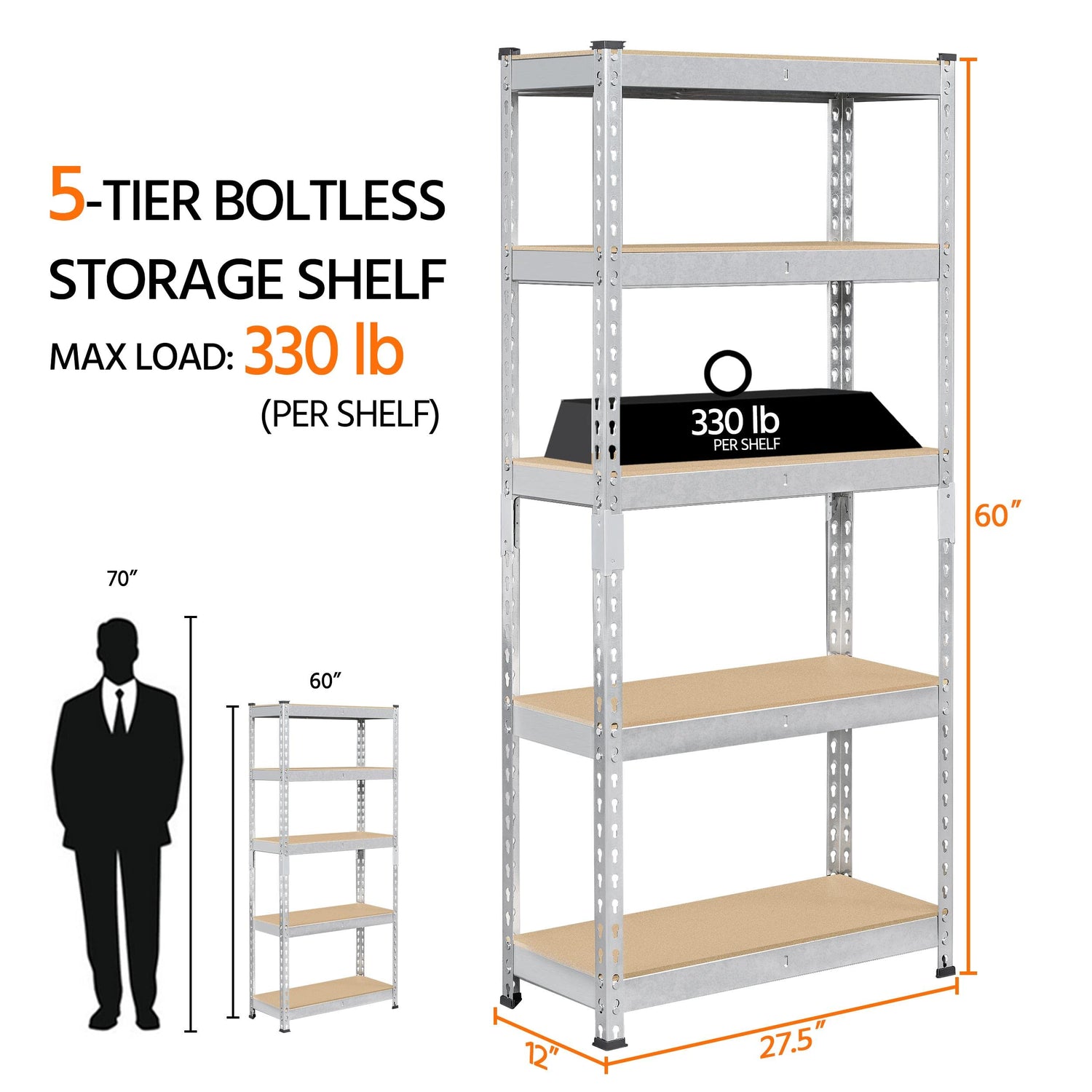 - Specifications: Material: Galvanized Iron Frame & MDF Boards; Colour: Silver; Overall Dimensions: 27.4″ L × 11.6″ W × 60″ H; Max. Load Capacity Per Tier: 330 lb; Gross Weight: 29.8 lb; Net Weight: 28 lb