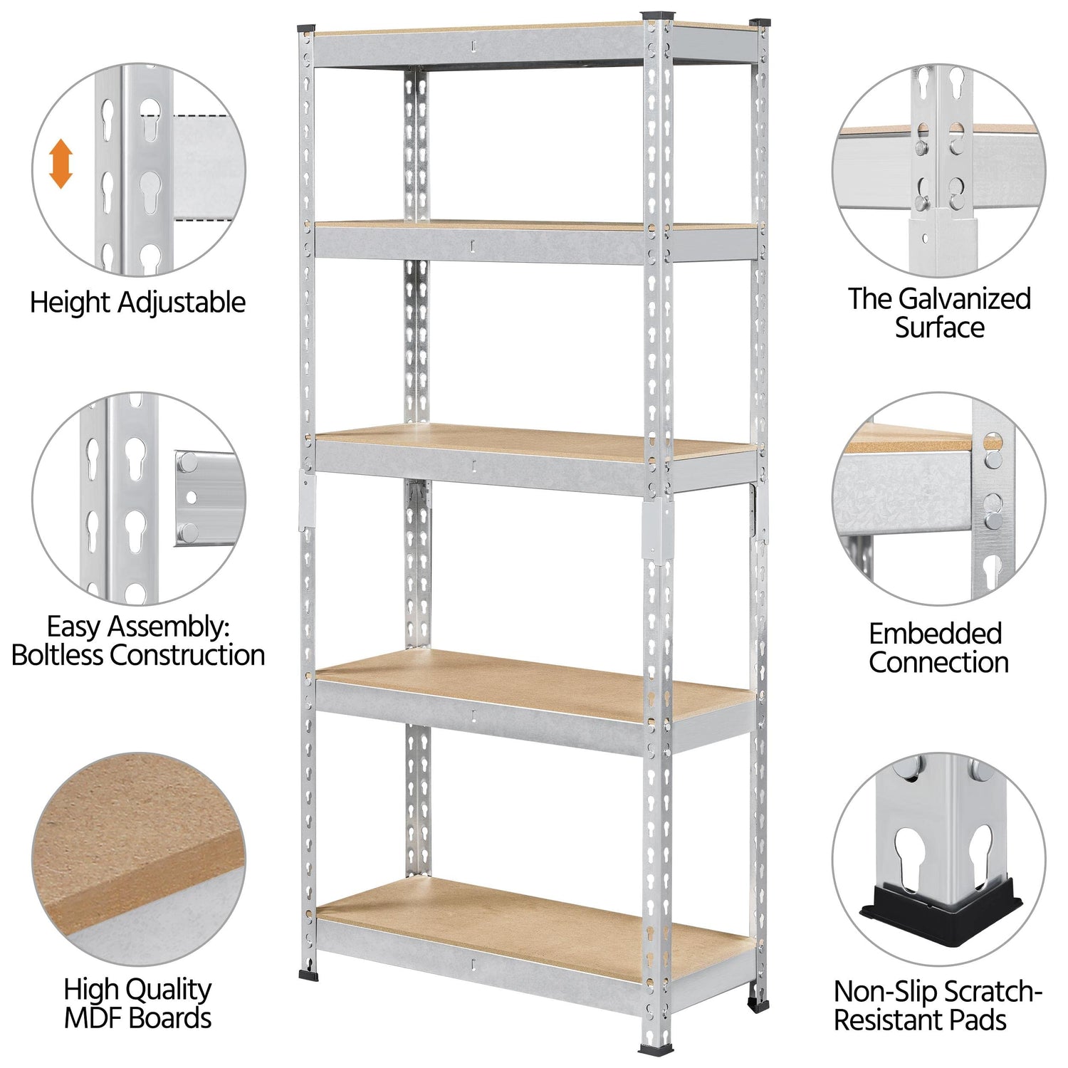 - 【Anti-skid Rubber Pads】This five-tier storage unit features rubber foot pads for added stability. Meanwhile, they can also avoid unnecessary scratches to damage the ground and floor during the movement
