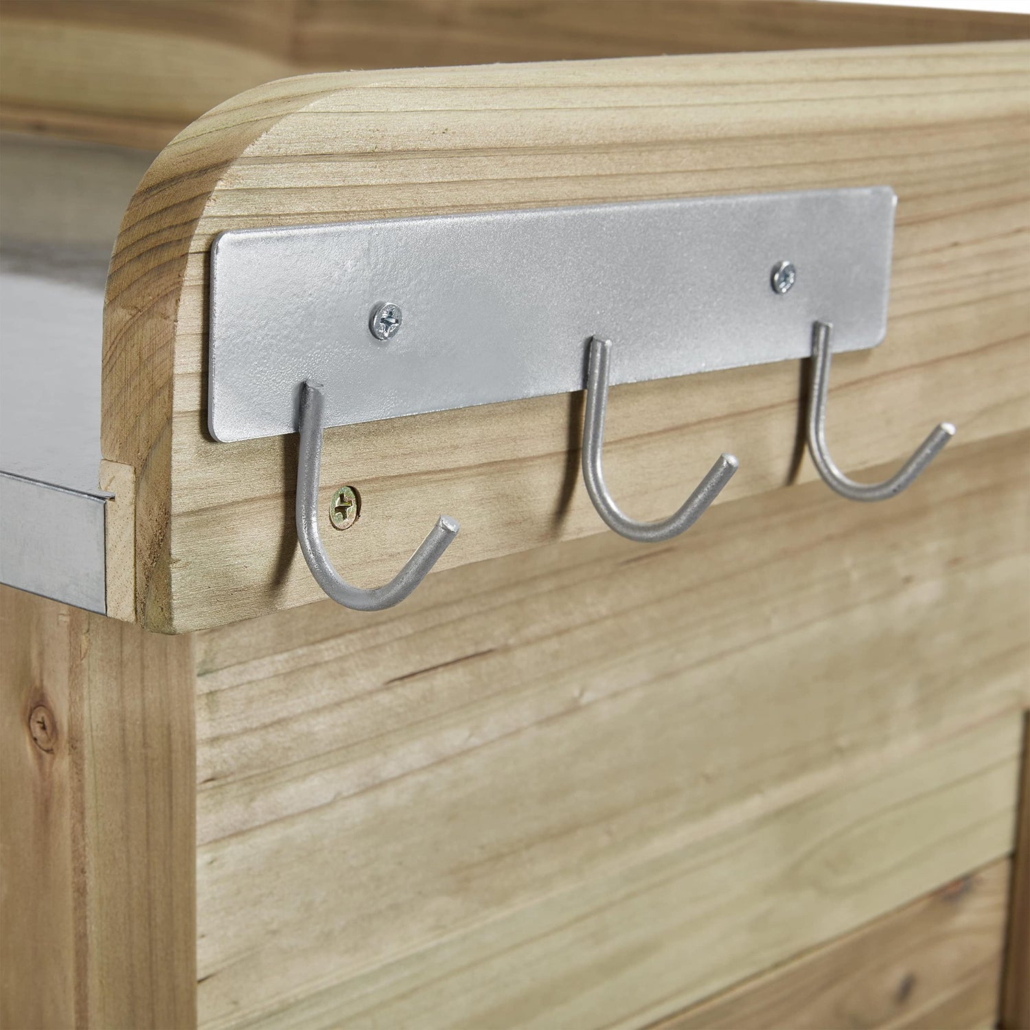Don’t you need a potting table? This Potting bench with storage is capable of all your needs for garden works. Not only do the natural wood structure and zinc tabletop function well on gardening, they are also a good blend with any garden space. Designed with a cabinet, a drawer and an open shelf, this potting bench can used to hold plants for repotting and adding soil, fertilizer and tools. Wood finish of this garden potting table complements virtually any outdoor decor. It provides you with a variety of storage options for your garden tools, i.e. side hooks, open shelves, one drawer and cabinet on each side. A free-standing style is easy for you to move it around as well. You can also use it as an extra table to serve tea on garden gatherings. Worthwhile investment indeed! Get this cabinet drawer potting bench to free yourself from ground work pains now!