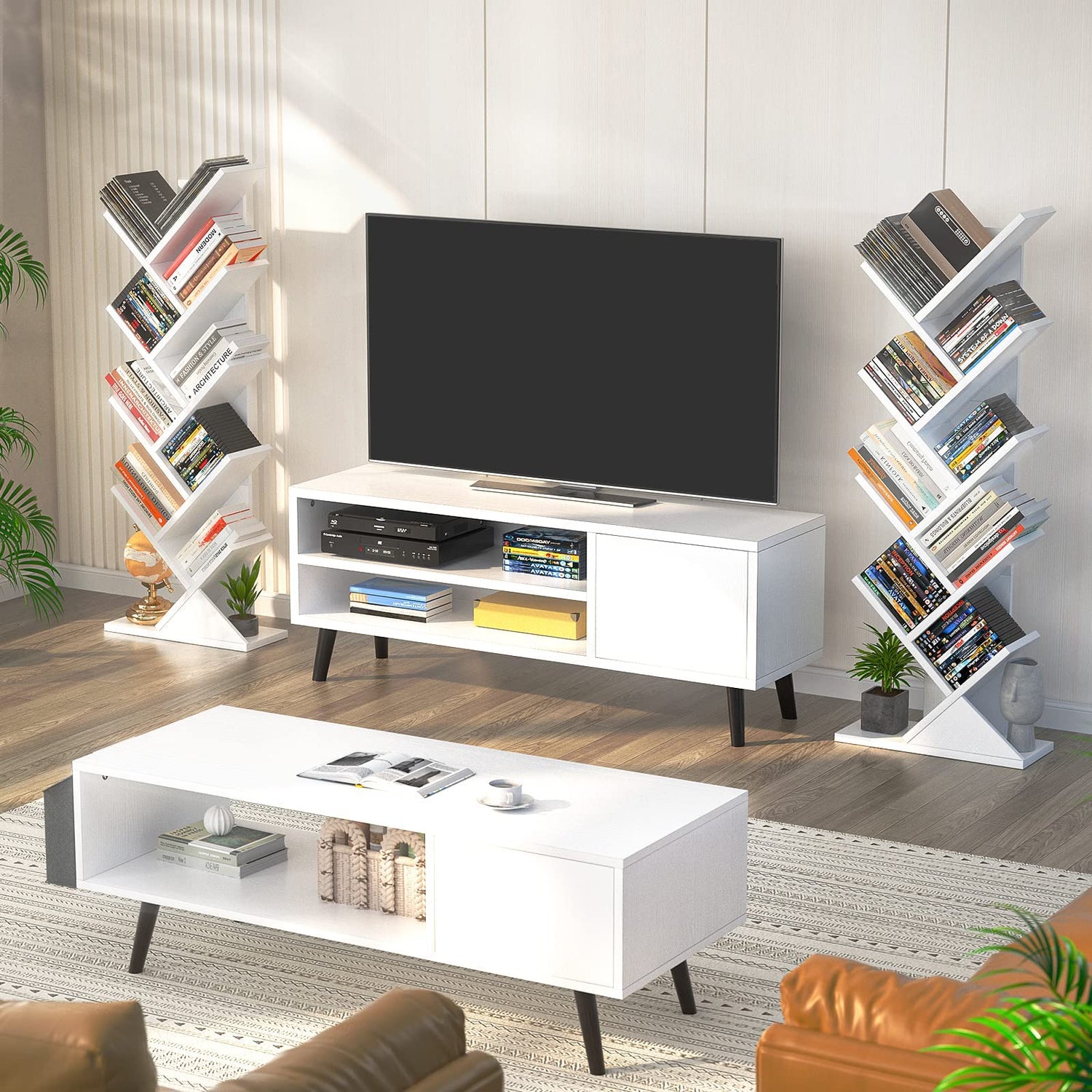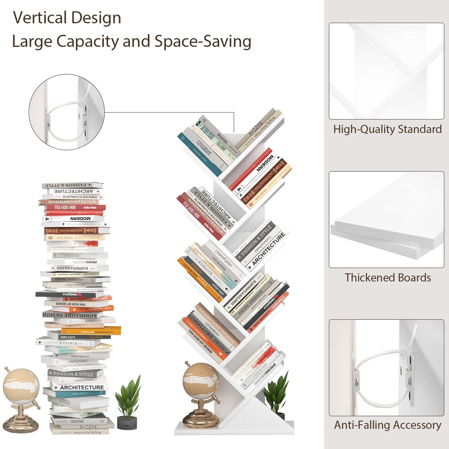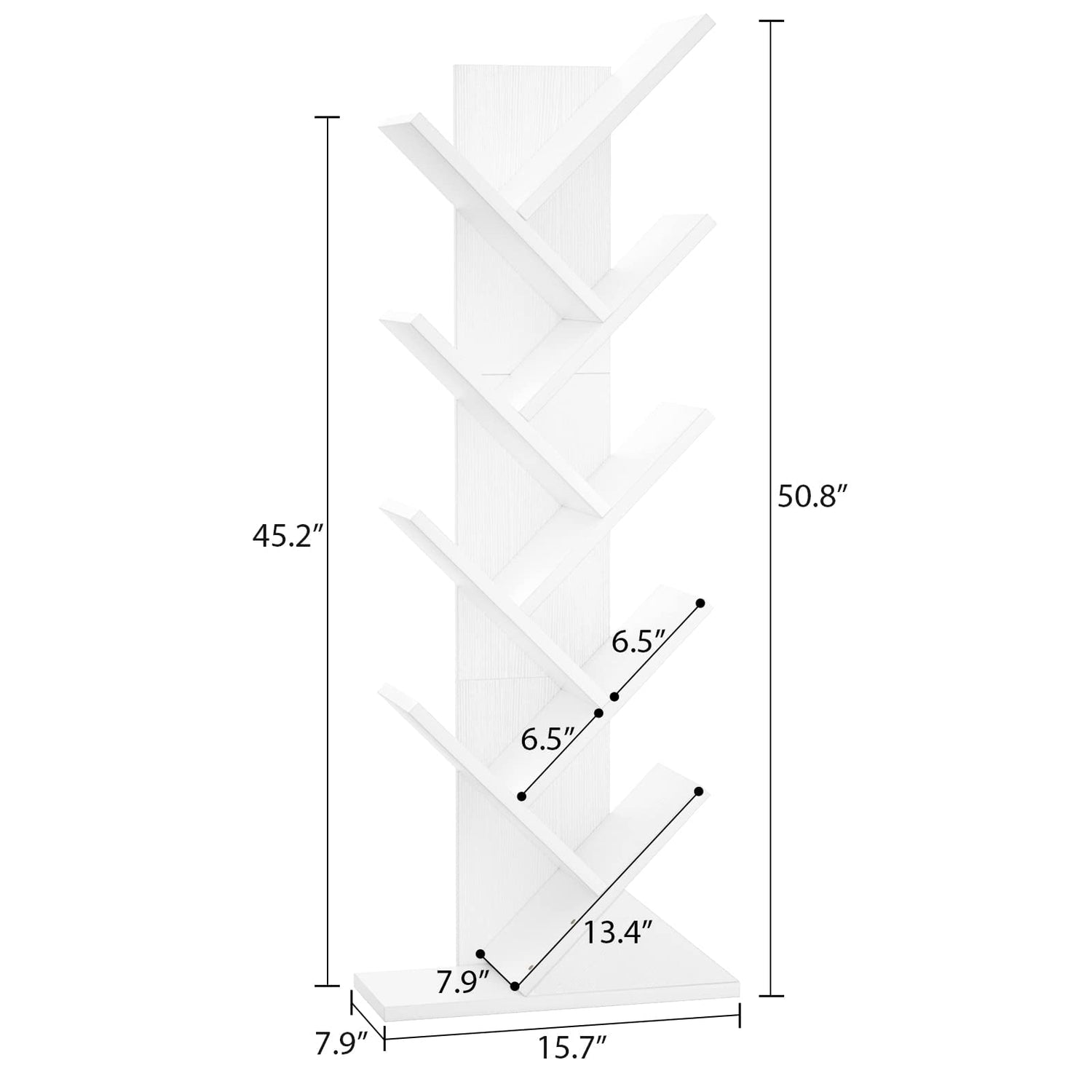 Topfurny Tree Bookshelf, 9-Tier Shelf Rustic Brown Bookcase, Retro Wood Storage Rack for CDs/Movies/Books, Anti-Fall Utility Organizer Shelves for Living Room, Bedroom, Home Office, White