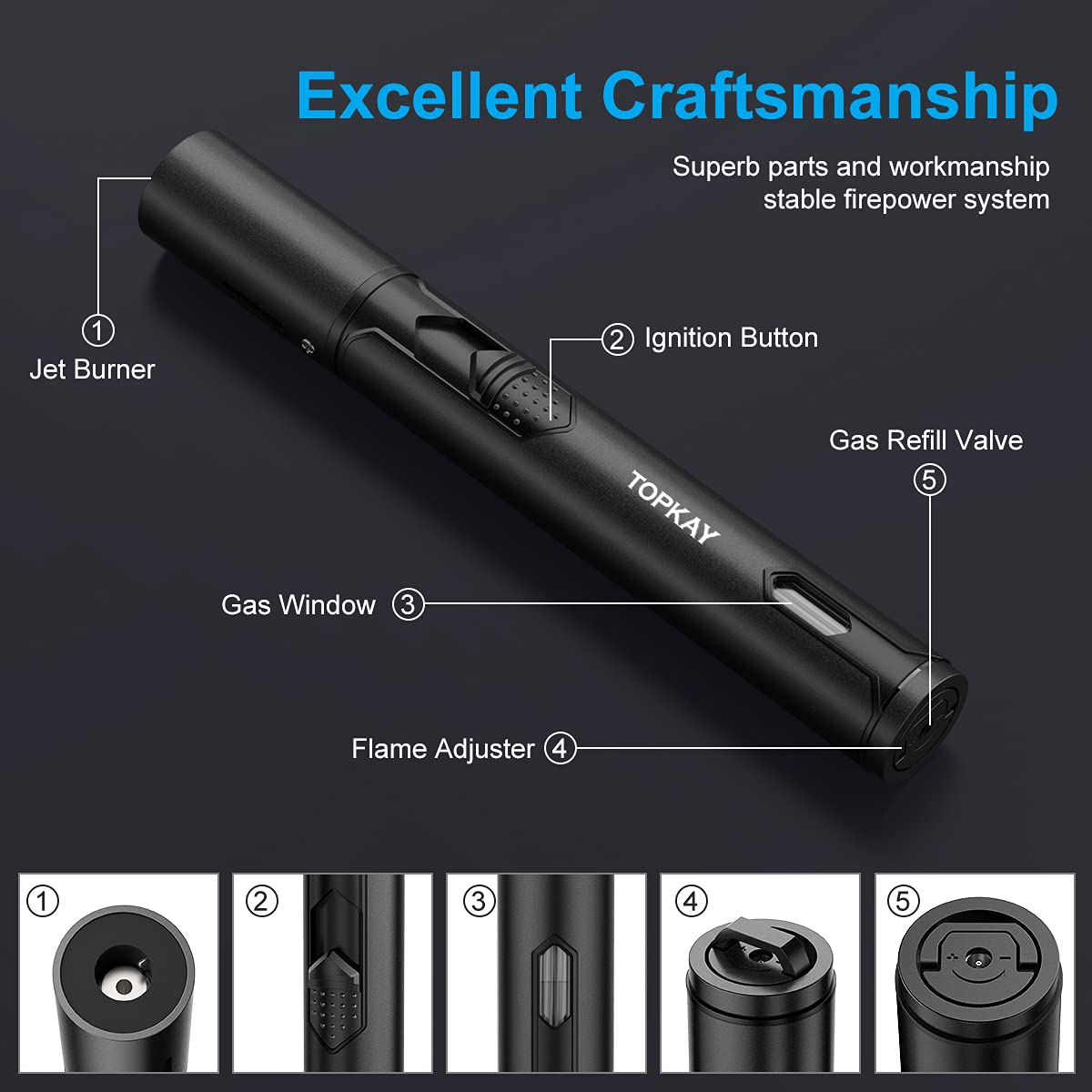 - 【REFILLABLE&ADJUSTABLE TORCH LIGHTERS】: This Pen Torch Lighter is Refillable. Easily Adjust the Flame by Turning the Flame Adjustment Knob Under the Lighter, You can Use your Hand to Adjust the Flame Level Directly, Large Flame Adjustment Knob Makes More Easier and Convenient to Set the Flame Height from Low to High.