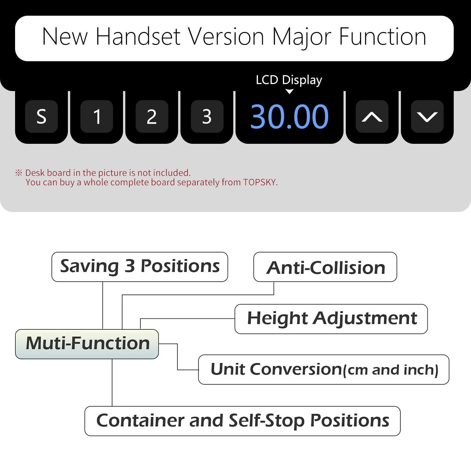 - Multi-Function: Easy and convenient to adjust the comfortable height and save 3 memory positions. Anti-collision function protects desk from colliding into obstacles. LCD display clearly shows you the exact height of the desk. Unit conversion function helps you to change the unit between inch and cm. Container and self-stop positions is used to limit the movement area of desktop.