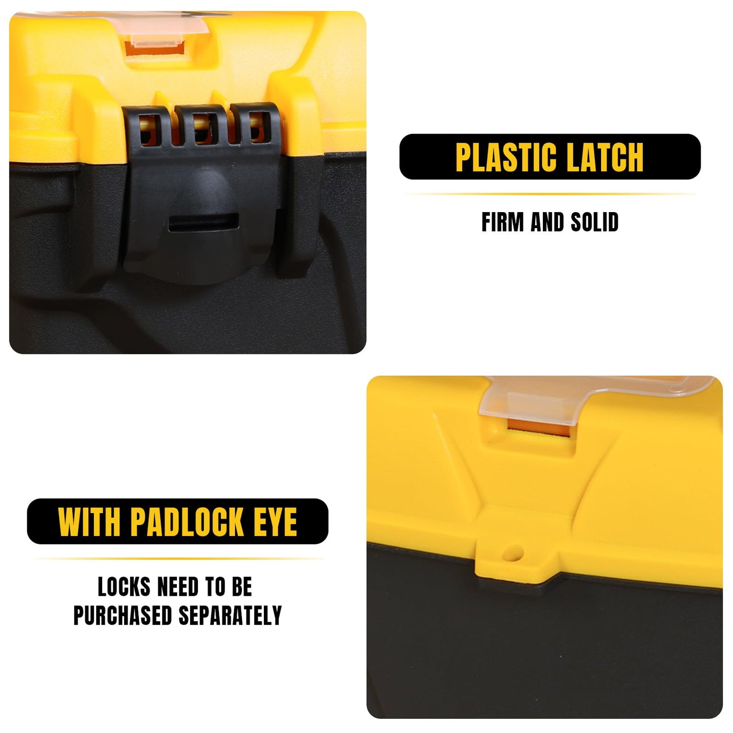 Details: This yellow plastic storage tool box is made of industrial grade plastic, with removable tray, comfortable handle, transparent small cover on the top and double lock to make the box perfect and safe.