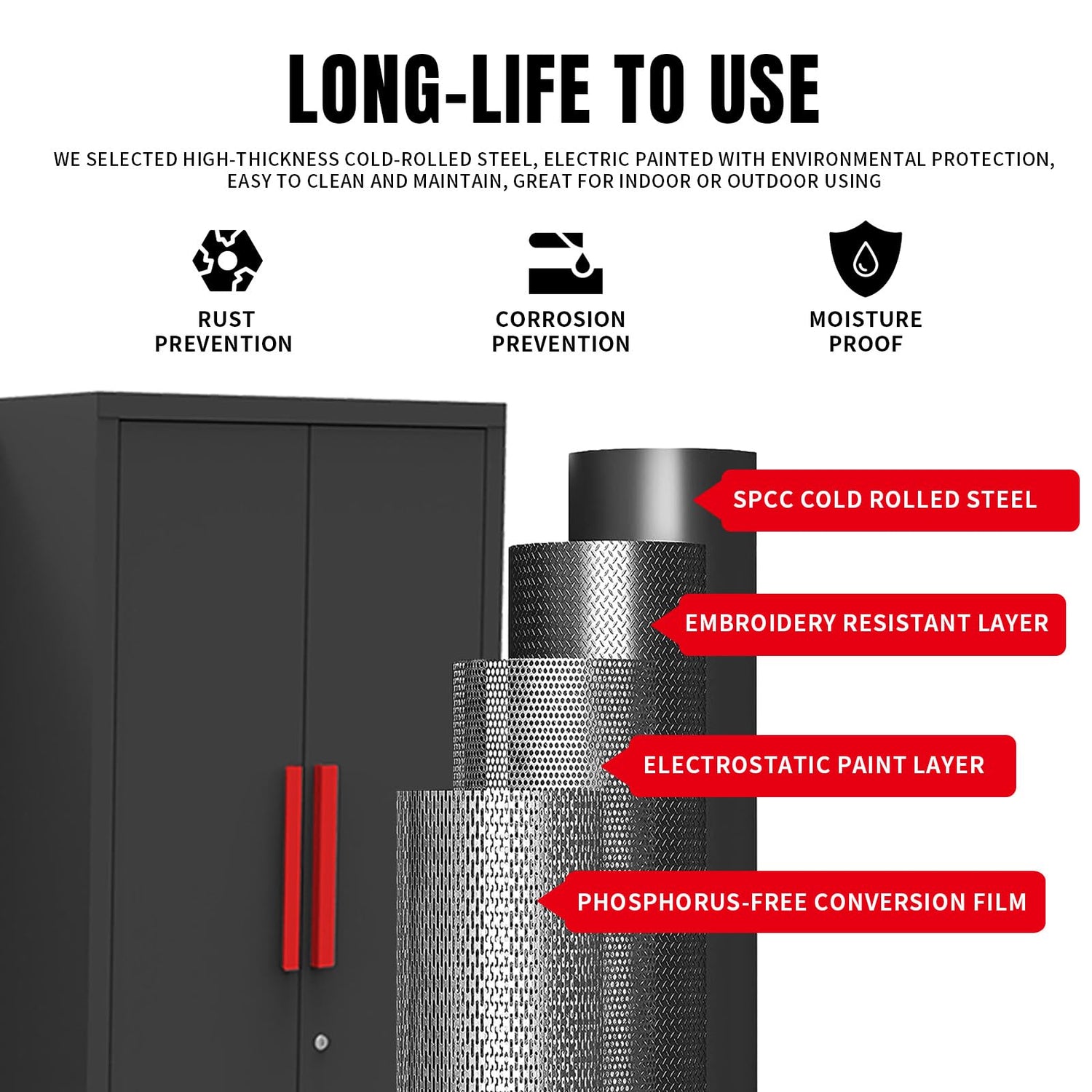 - Heavy Metal Structure: Heavy metal cabinets with furniture locks are made of 100% cold rolled steel and forged with a thickness of 0.8mm. Cabinets are of all-welded construction. The reinforced structure makes the black metal cabinets with locks safer, stronger, and more durable. The black garage tool cabinet also adopts a newly developed coating, which has strong wear resistance and extends its service life.