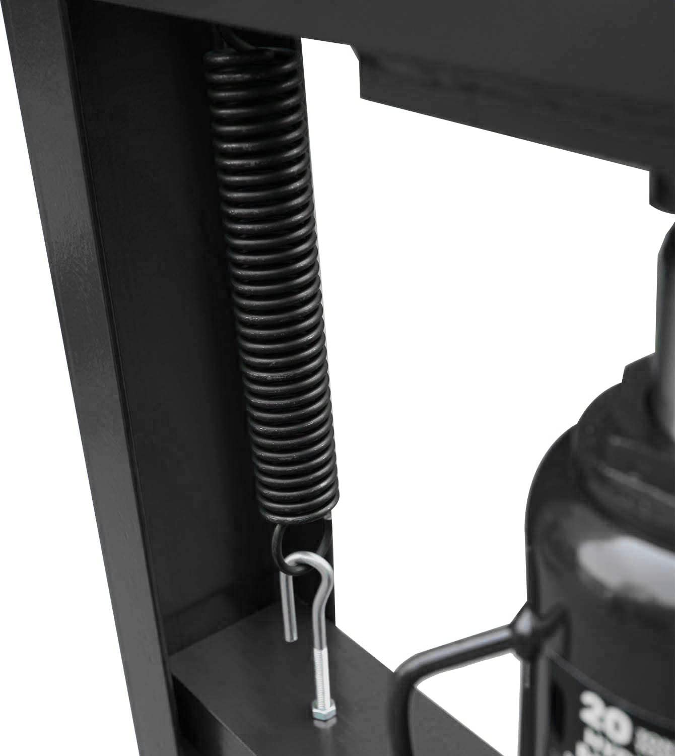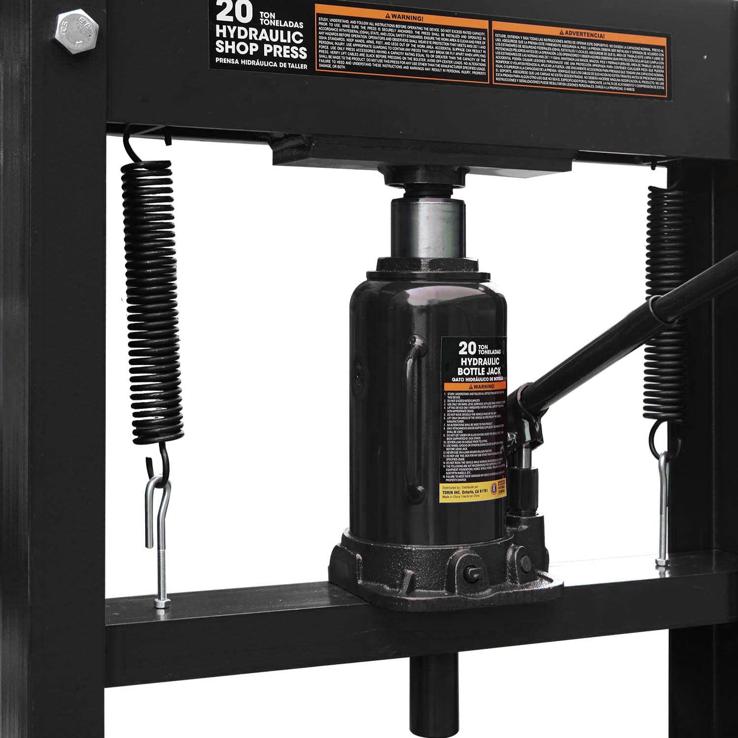 Details: The Torin ATY20011 heavy-duty steel H-frame hydraulic garage/shop floor press is designed for straightening, bending, pressing, and stamping. Equipped with a 20 ton40,000 lb capacity bottle jack with a working range from 0 to 28. Manually raise and lower the table surface for the best working distance for the job. Includes arbor press stamping plates that feature V-blocks and a 180-degree guide design. Features high quality precision springs for slowly and safely bouncing back after pressing down operation. The piston-ram is treated and polished to resist skiving. After a thorough chemical wash to ensure a long-lasting finish and to help prevent rust, it's treated with a powder-coated, lead-free paint, providing a durable coating which is oil, grease, and dirt-resistant for easy cleanup. Meets ASME PASE safety standards and includes a limited 1 year manufacturer.