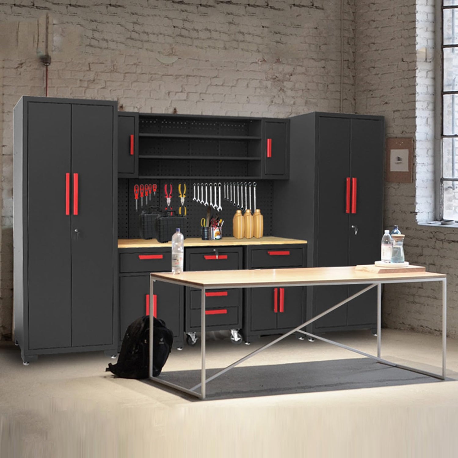Torin Garage Storage Cabinets System, 8-Pcs Workshop Cabinet Set in Black, Included Steel Cabinets Drawers Rolling Chest and Pegboard,Locked Garage Storage Cabinet