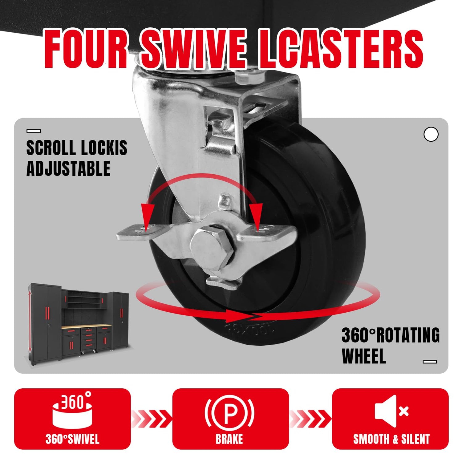 Details: The size of garage storage cabinet set are 130"L x19"Dx 76"H inches. Locker x2, Wall cabinet x2, 1-drawer roller cabinet x2, 4-drawer roller cabinet x1, 71 in workbench x1, Pegboard x10, Shelf to connect the wall cabinets x4. For stability, high cabinet s can optionally be fixed to the wall. Overall weight capability : Locker 820 lbs., Wall cabinet 50 lbs., 1-drawer roller cabinet 620 lbs., 4-drawer roller cabinet 380 lbs., 52in workbench 800 lbs. The locker can also be used with a pegboard for hanging a variety of small items and tools. Its versatile metal pegboard adapts to different sizes and specifications of hooks, organizers and accessories to organize tools and clutter in garages, sheds, workshops and more. The pegboards feature a durable powder-coated finish that prevents rusting and cracking. The metal pegboard is stronger and more durable than traditional pegboards. Overall, this storage cabinet features sturdy construction, strong weight capacity, easy to move and assemble. It can meet the storage needs of different occasions and is suitable for garages, offices, factories, warehouses and other places. Meanwhile, its details are well handled, such as the use of high-quality materials, coating treatment, adjustable design, and so on. Whether you need a cabinets for easy mobility, a closet for storing tools or a cabinet for storing office files, this storage cabinet can meet your needs.