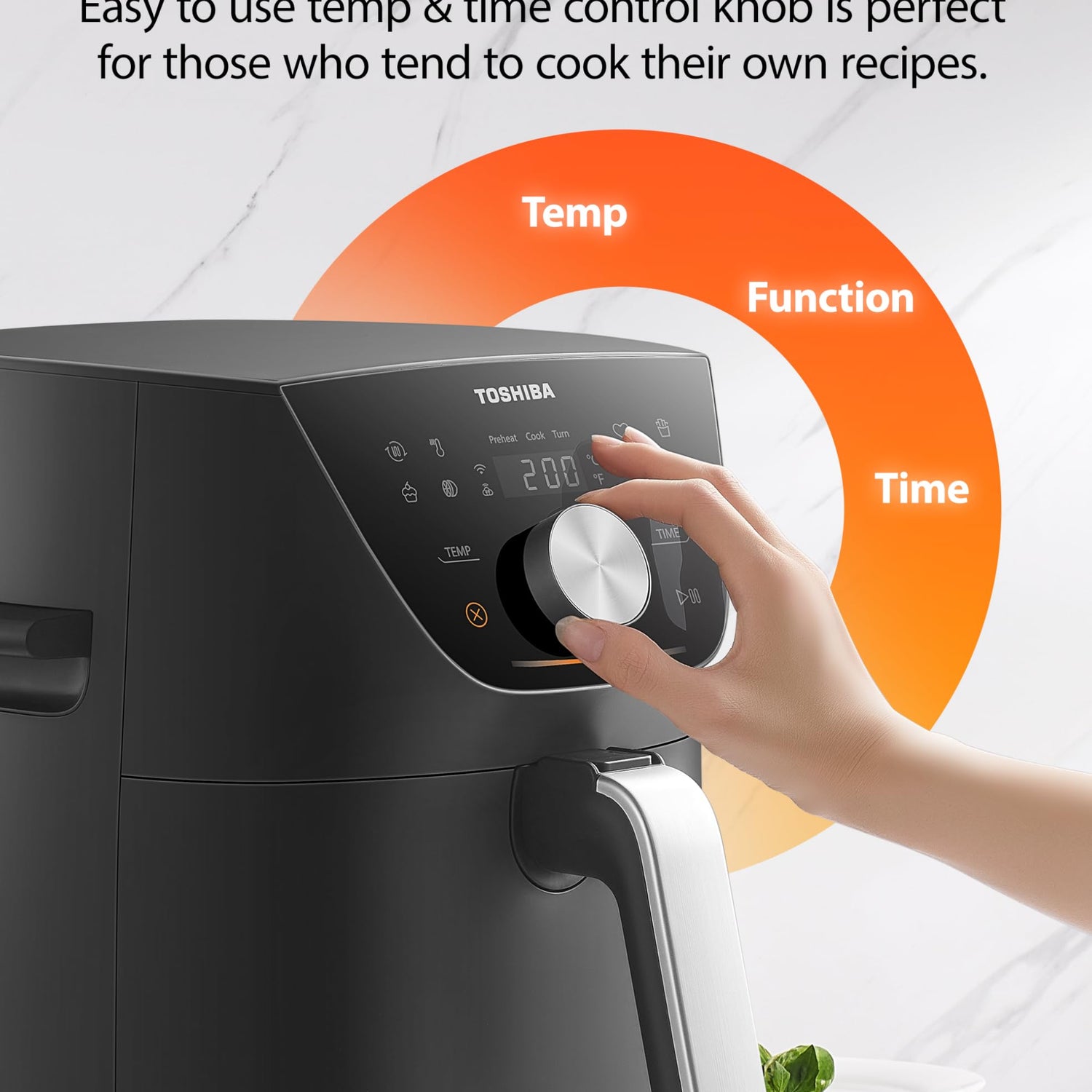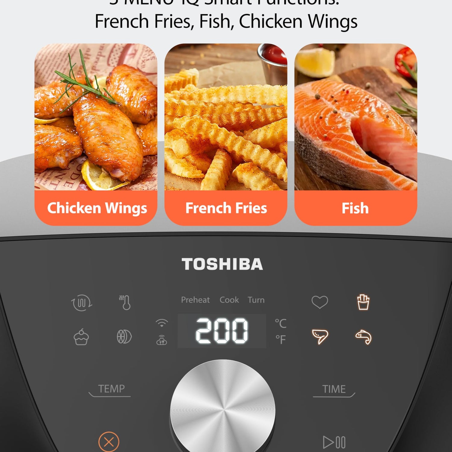 Details: Toshiba 5.5QT Air Fryer Heat-Q Technology, Quick and Easy Meals, 8 Preset Menus and Menu-IQ Function, 1°F Precision, 90% less oil, Double-sided Handles Easy Carrying, Dishwasher Safe