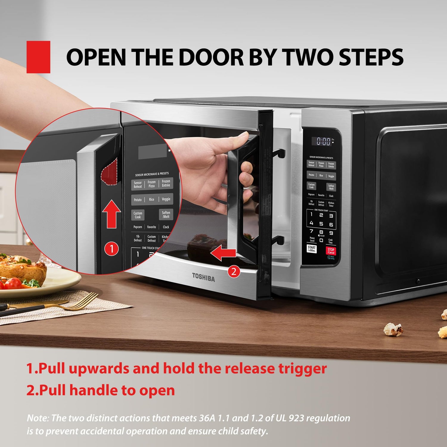Details: This Toshiba 1.2 Cubic feet 1100 watt Stainless Steel microwave is the ideal size for apartment kitchens or office break rooms. Sensor reheating lets you optimally cook six of the most popular food items with the touch of a button. Choose from ten power levels up to 1100 watts. The large digital display has a clock function and can also display a countdown timer as well as the cooking time remaining. Program up to three favorite time and power combinations for additional one-touch convenience. Easily open or close the microwave with the large, easy-to grip door handle. The Stainless Steel exterior looks good in any kitchen. Voltage - 120V-60Hz.
