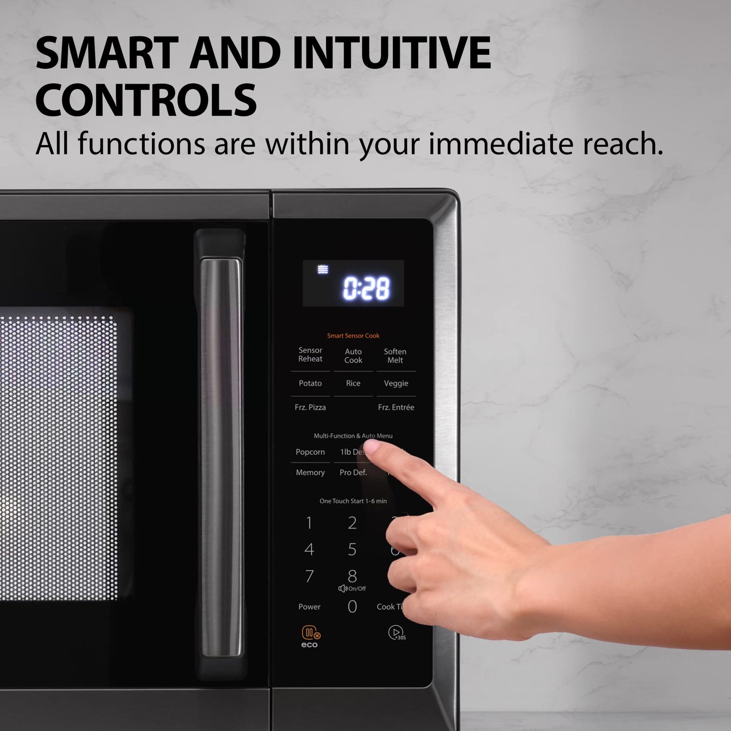 - 【Convenience Features】 1lb defrost, memory function to set up your most-used microwave routine, multistage cooking, child safety lock, clock and kitchen timer, mute function, ECO mode