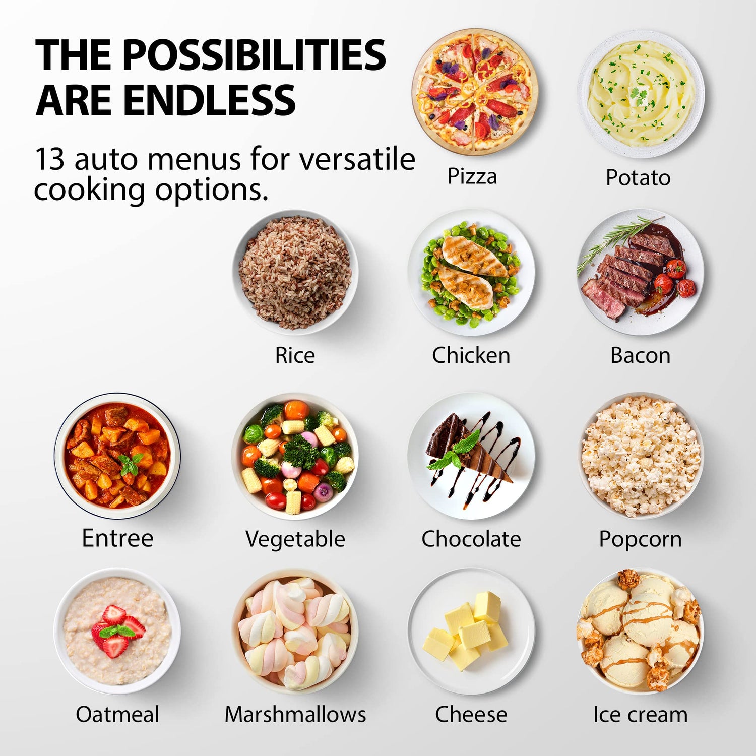 - 【12 Easy & Handy Auto Menus】 Enjoy optimum heating of 12 popular foods like pizza, potato, vegetables and more