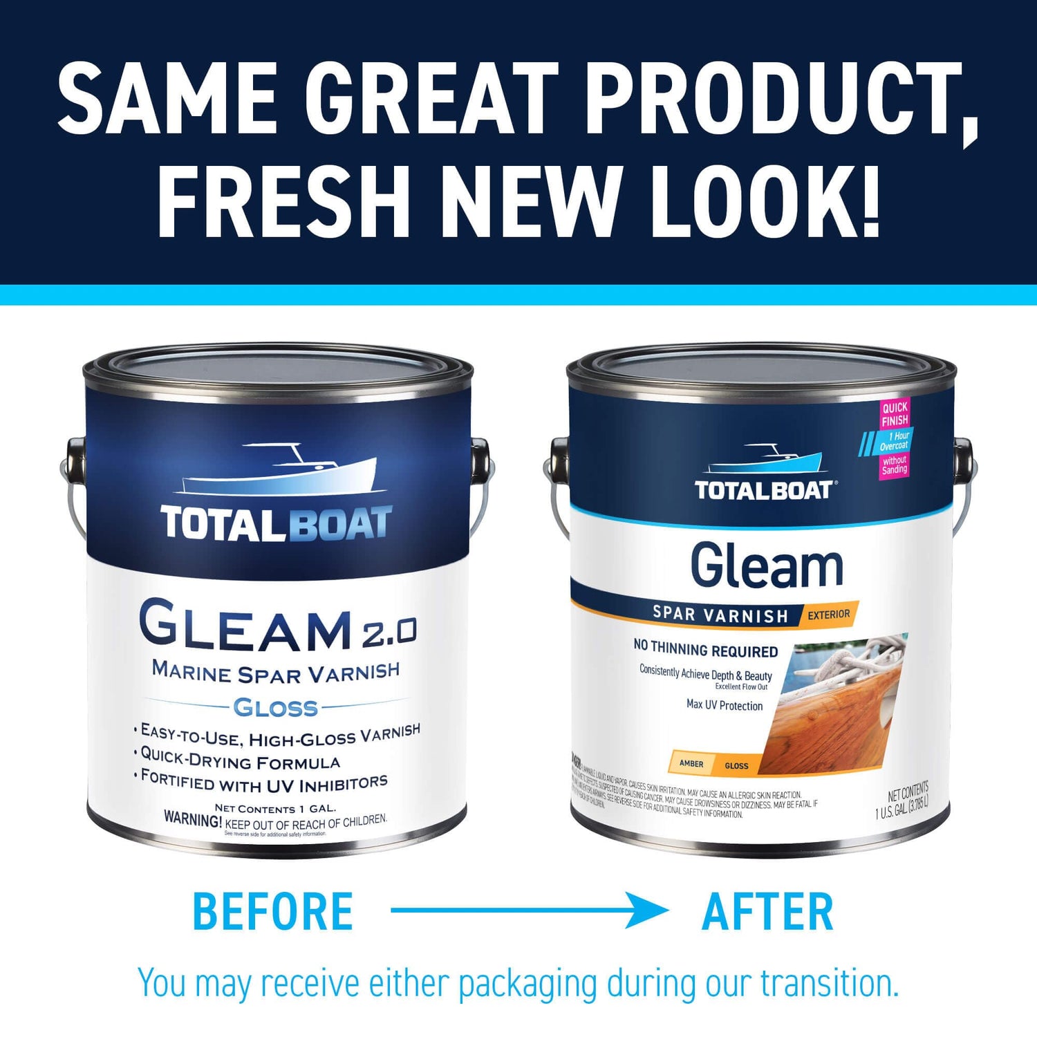 Details: TotalBoat Gleam is a classic style marine spar varnish that not only withstands the rigors of life at sea, it also makes the ideal wood varnish and wood sealer for all of your outdoor wood furniture, bar tops, tiki bars, picnic tables, patio tables, Adirondack chairs, antique wooden truck beds and more. This high-quality tung oil and phenolic resin formula contains UV inhibitors that provide lasting beauty, and a durable finish that expands and contracts with seasonal temperature changes to prevent chipping, cracking, and peeling. Use Gleam on interior and exterior wood for a tough, waterproof, marine polyurethane finish that won't fade. It's improved formula flows better, won’t leave brush marks, and has better overcoating & cure times, making it easy to get great results. Each coat provides medium build with excellent flow-out. You'll love how it flows off the brush and self-levels, leaving a smooth durable surface. Gleam gives all wood surfaces a radiant, transparent, warm amber hue in gloss or satin (matte) finish. For a high gloss varnish finish, apply 4-6 coats of Gleam Gloss. For a sleek satin finish, build with coats of the Gleam gloss varnish, and apply Gleam Satin for the final 1-2 coats. Whichever formula you choose, you’ll appreciate that Gleam’s improved formula allows you to scuff and apply additional coats quicker than ever because you can recoat in 1 hr. at 72 degrees F, and apply up to 3 coats in 1 day. Compare to gloss varnish, matte varnish, polyurethane wood finish, exterior polyurethane, matte polyurethane and polyurethane sealer products such as Epifanes Clear Varnish, Wood Finish Matte, Wood Finish Gloss, Pettit Flagship Varnish, Z Spar Captain's Varnish, Minwax Helmsman Spar Urethane, Rust-Oleum Marine Spar Varnish, System Three Clear Marine Spar Urethane Varnish Coating, and Old Masters Spar Marine Varnish. All TotalBoat products are developed for boaters by boaters, to provide great value and great results. 100% made in the USA.