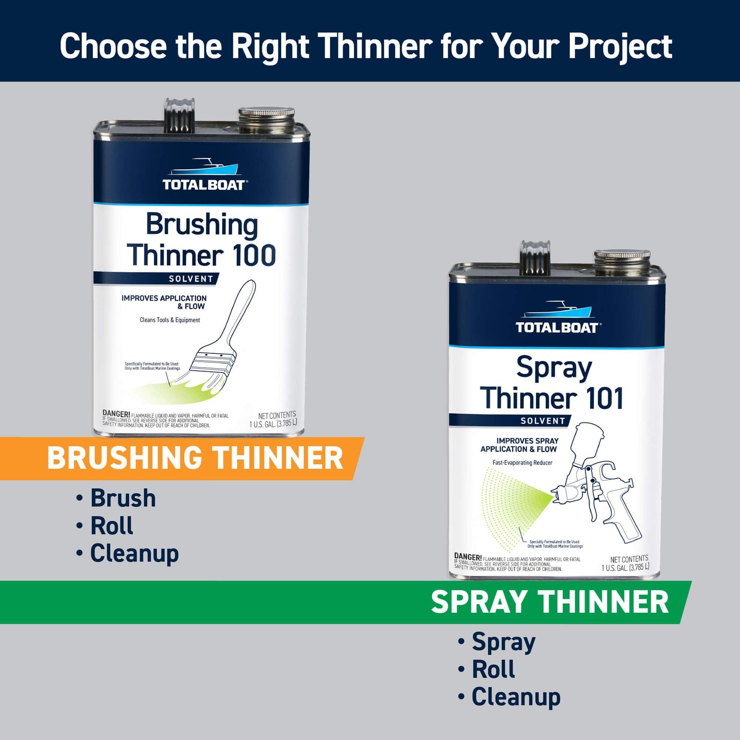 - AVAILABLE IN GLOSS OR SATIN (low-sheen), in Pint, Quart and Gallon sizes; Coverage: 360-400 sq ft/gallon; Thinner: TotalBoat Special Brushing Thinner 100 (brushing/rolling); TotalBoat Spray Thinner 101 (spraying)
