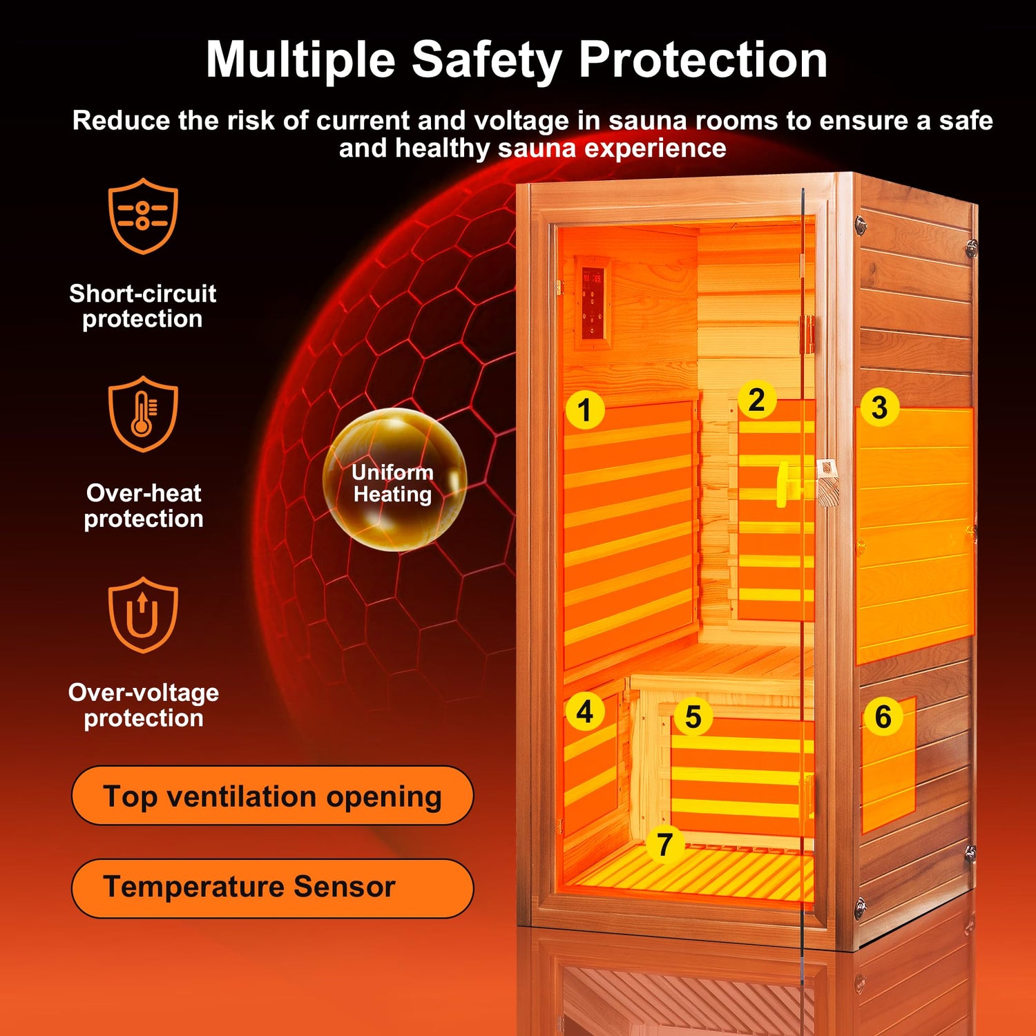 - 【Premium Wooden Sauna】Constructed with beautiful, durable Douglas Fir wood for excellent heat insulation and longevity. Features robust tempered glass for stability. Its space-saving dimensions (31.5"x31.5"x63") integrate effortlessly into your home, ensuring convenient and worry-free relaxation.