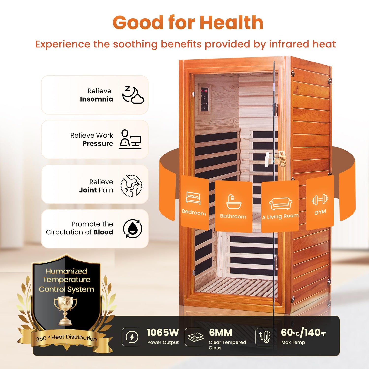 - 【Comfortable 1 Person Sauna】Experience rejuvenating far infrared heat, known to support skin health, blood circulation, and metabolism. Unwind while reading, listening to music via Bluetooth, or meditating. Features a multi-functional wooden handle (external iPad shelf & internal towel holder).