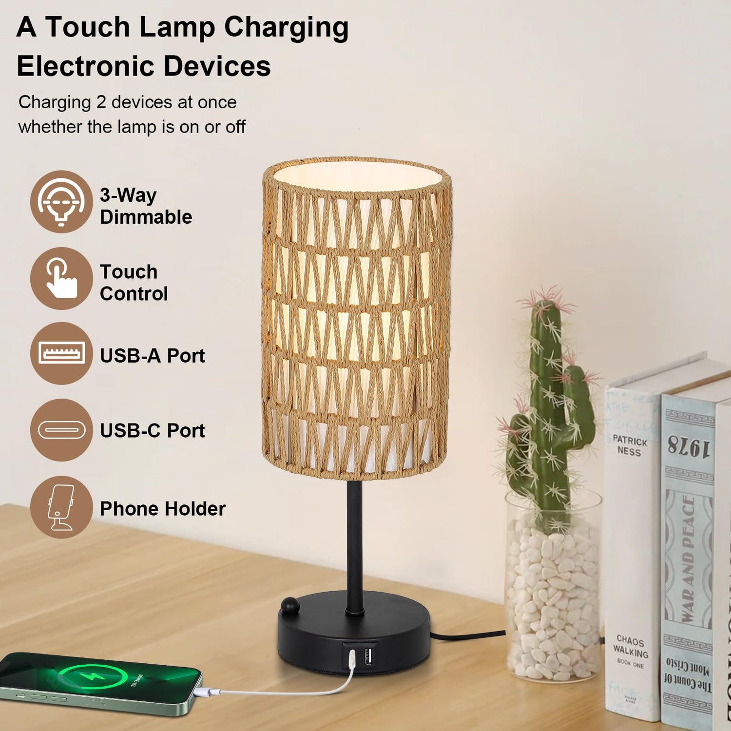 Touch Table Lamp For Bedroom with Bulb, Boho Small Desk Lamp For Living Room With Rattan & Linen Shade, 3 Way Dimmable Bedside Table Lamp For Nightstand With USB Charging Port & Phone Stand For Office