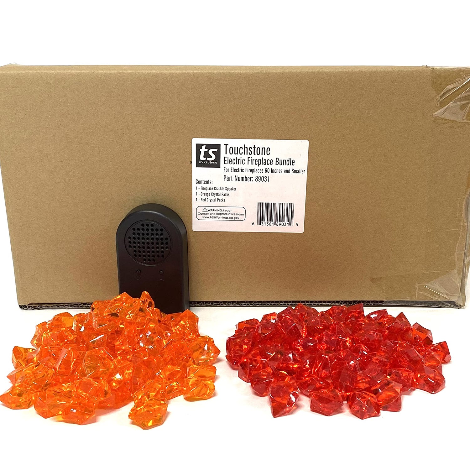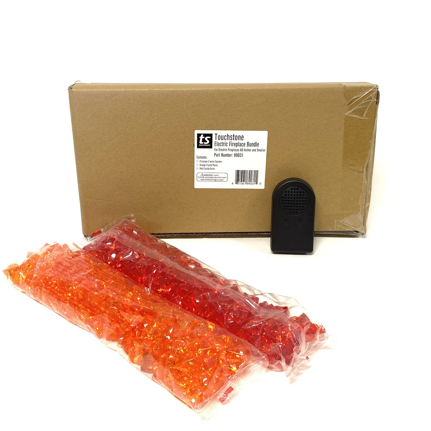 - What's in the Box? - This small Touchstone Electric Fireplace Accessory Bundle includes 1 fire crackle speaker, 1 pack of orange crystals, and 1 pack of red crystals.