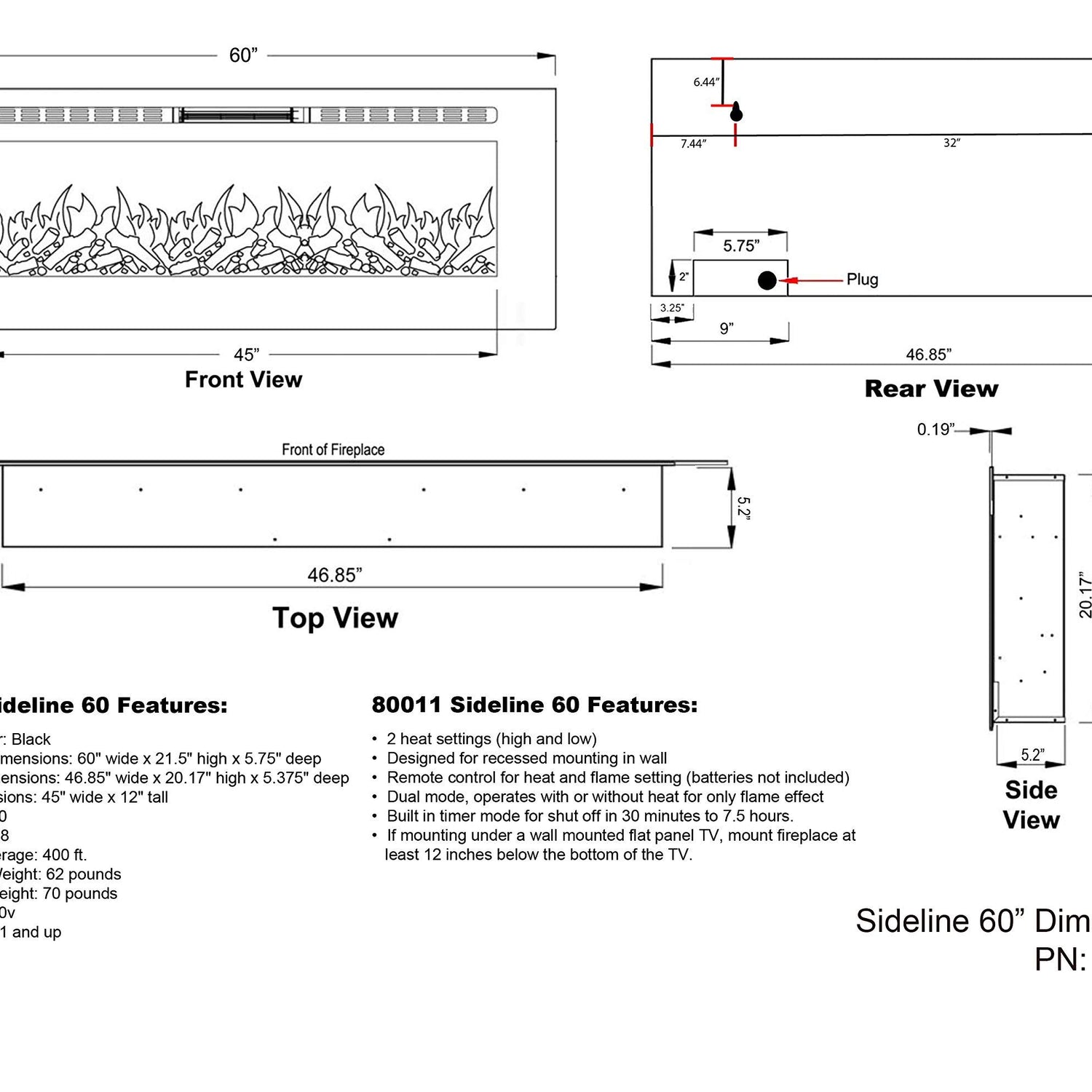 - INSTALLATION: This Sideline installs simply and can safely be attached to framing studs. The sides & back of the unit remain cool to the touch with the heat feature on. Recommended minimum of 8” of space between the top of the fireplace and your TV, mantel, picture ceiling. The Sideline can be installed in existing fireplace openings safely. Consult with a licensed professional to ensure your unused gas lines and vents are secured properly. The Sideline fireplace is ventless.
