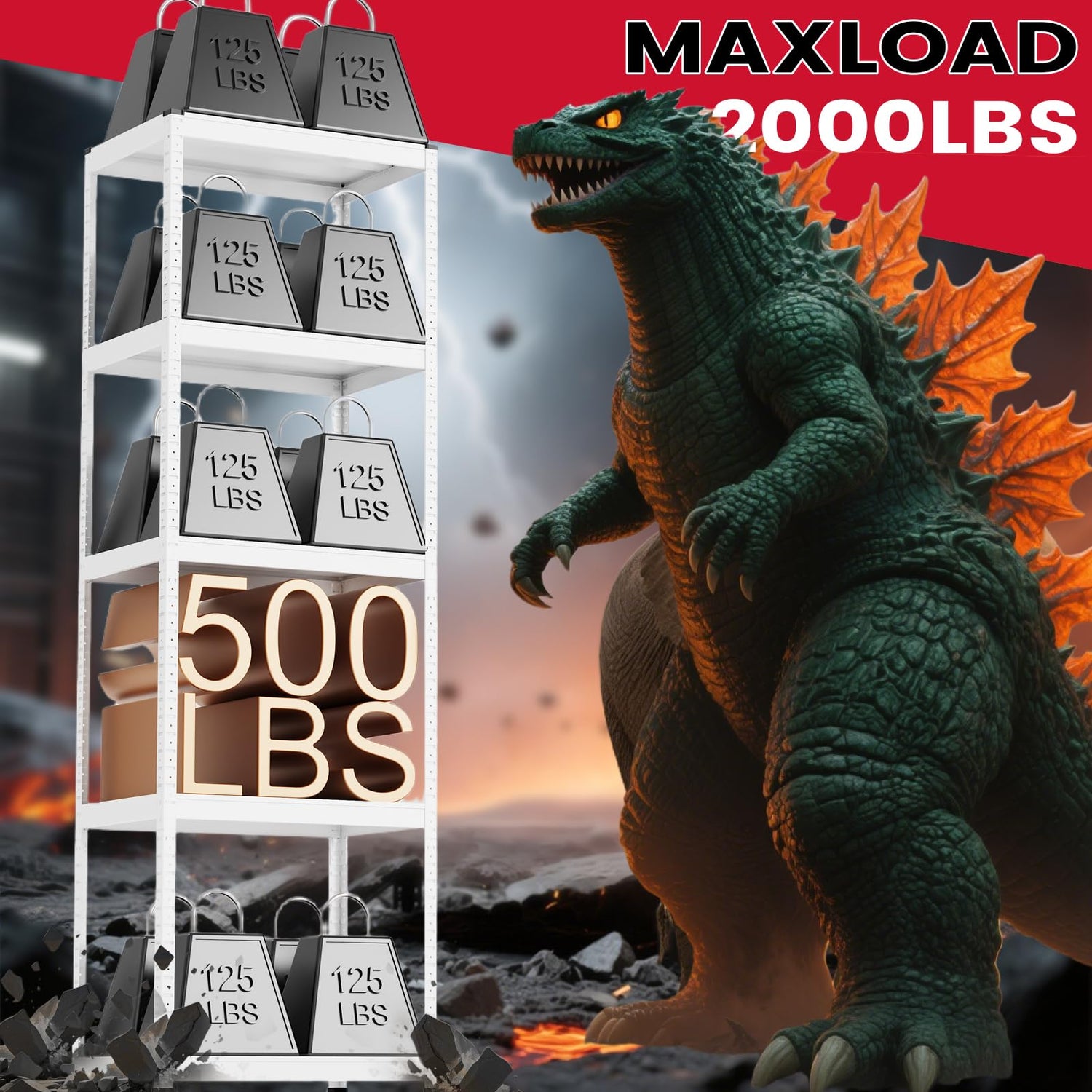 - Modular Storage Shelves Heavy Duty Load 2000LBS: TOYEAR storage shelves adopts rolled edge thickened columns, each metal shelving with support ribs. Made of heavy-duty galvanized metal,so each shelf can hold up to 500 lbs, with a total bearing capacity of 2000 lbs, which makes 5-tier closet shelves more stable, solid and more stuff can be stored