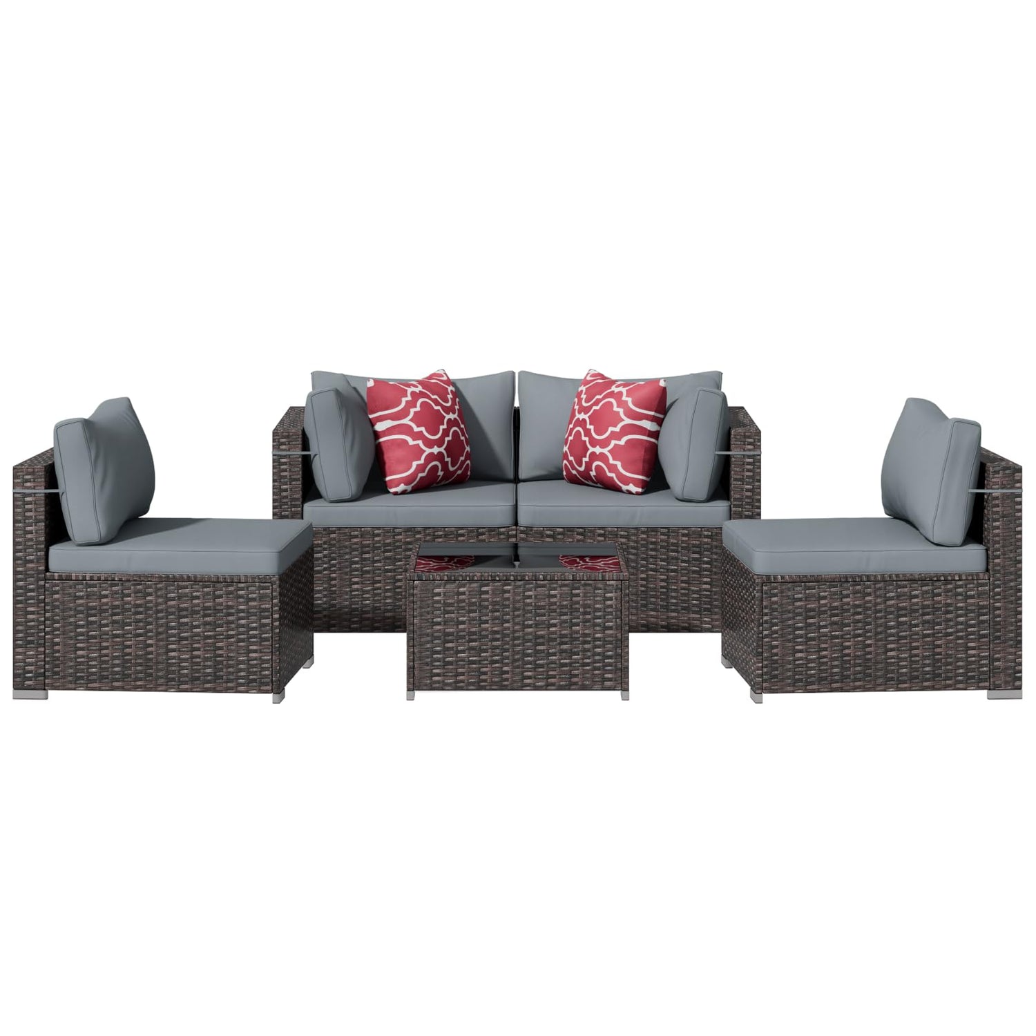 Tradare 5 Pieces Outdoor Patio Furniture Set, Wicker Patio Conversation Sectional Sofa Set, All Weather PE Rattan Sofa with Glass Table and Grey Cushions