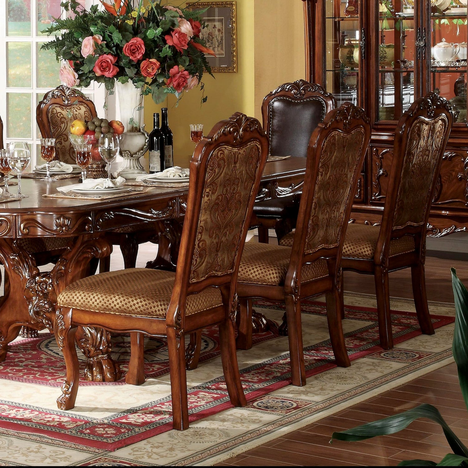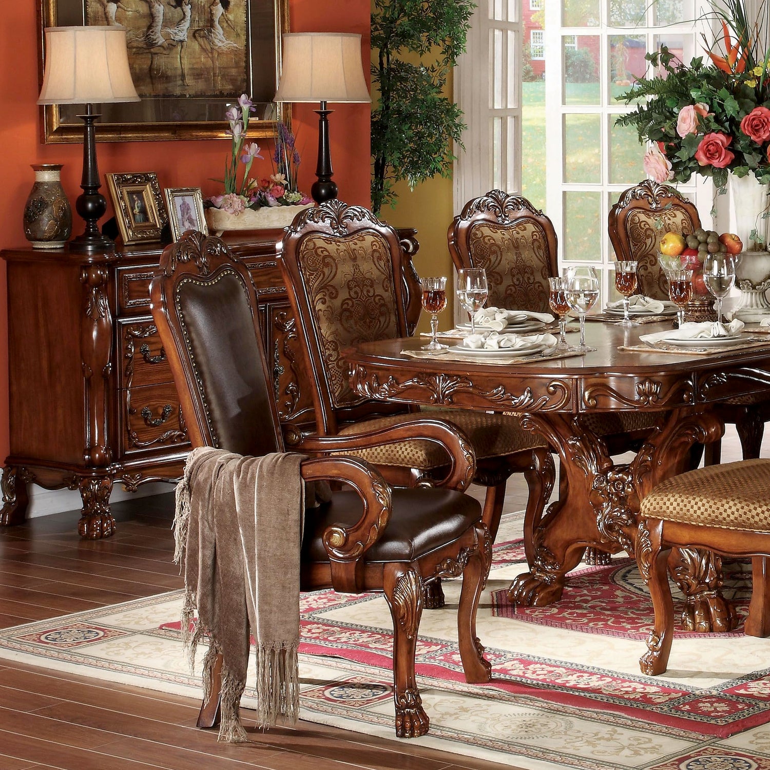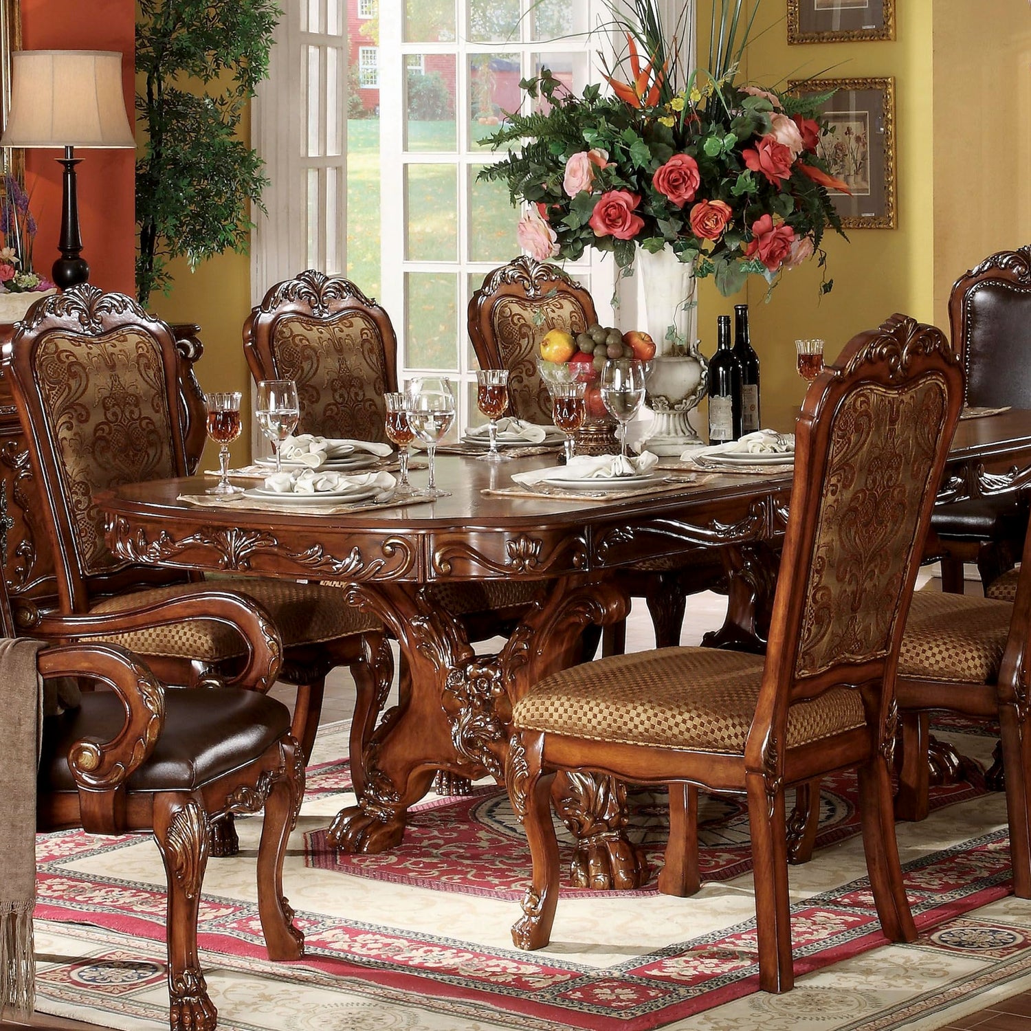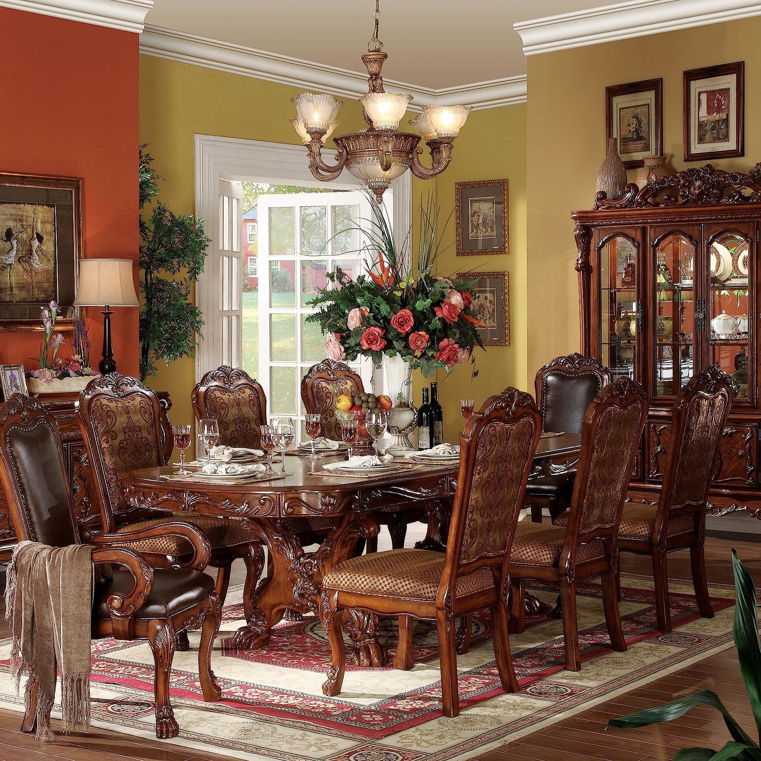- ✔Elegant Traditional Style with Rich Carvings: This 9-piece dining set reflects timeless traditional aesthetics, featuring a pedestal table base, oversized claw feet, and decorative inlay veneers that create a luxurious and formal dining environment.