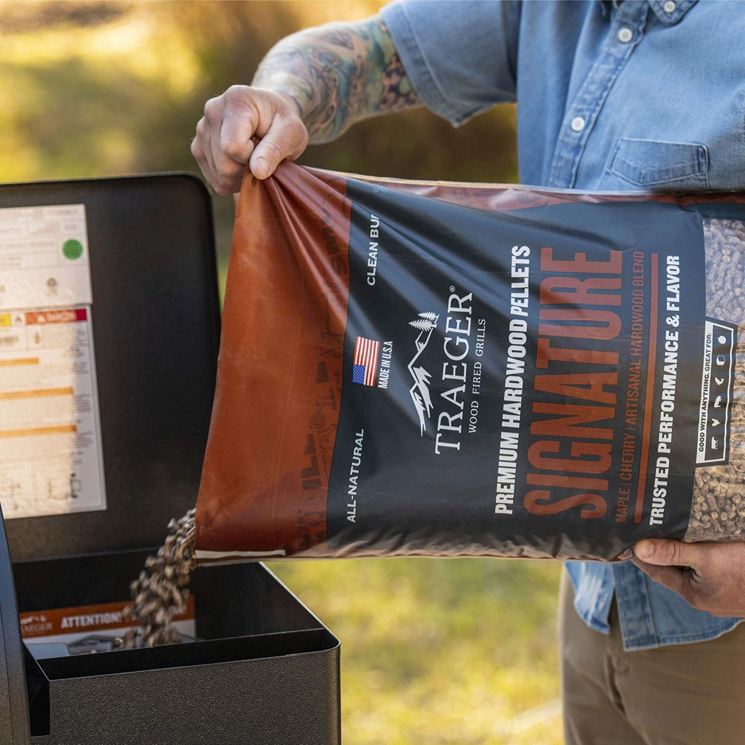 - SIGNATURE BLEND WOOD FIRED FLAVOR: The flavors of hickory, maple, and cherry hardwoods combine for in our Traeger Signature Blend Hardwood Pellets for flavor that can take on just about anything you cook; From classic BBQ meats, to fish and veggies, this versatile blend gives you full-bodied flavor you'll go back to time and time again