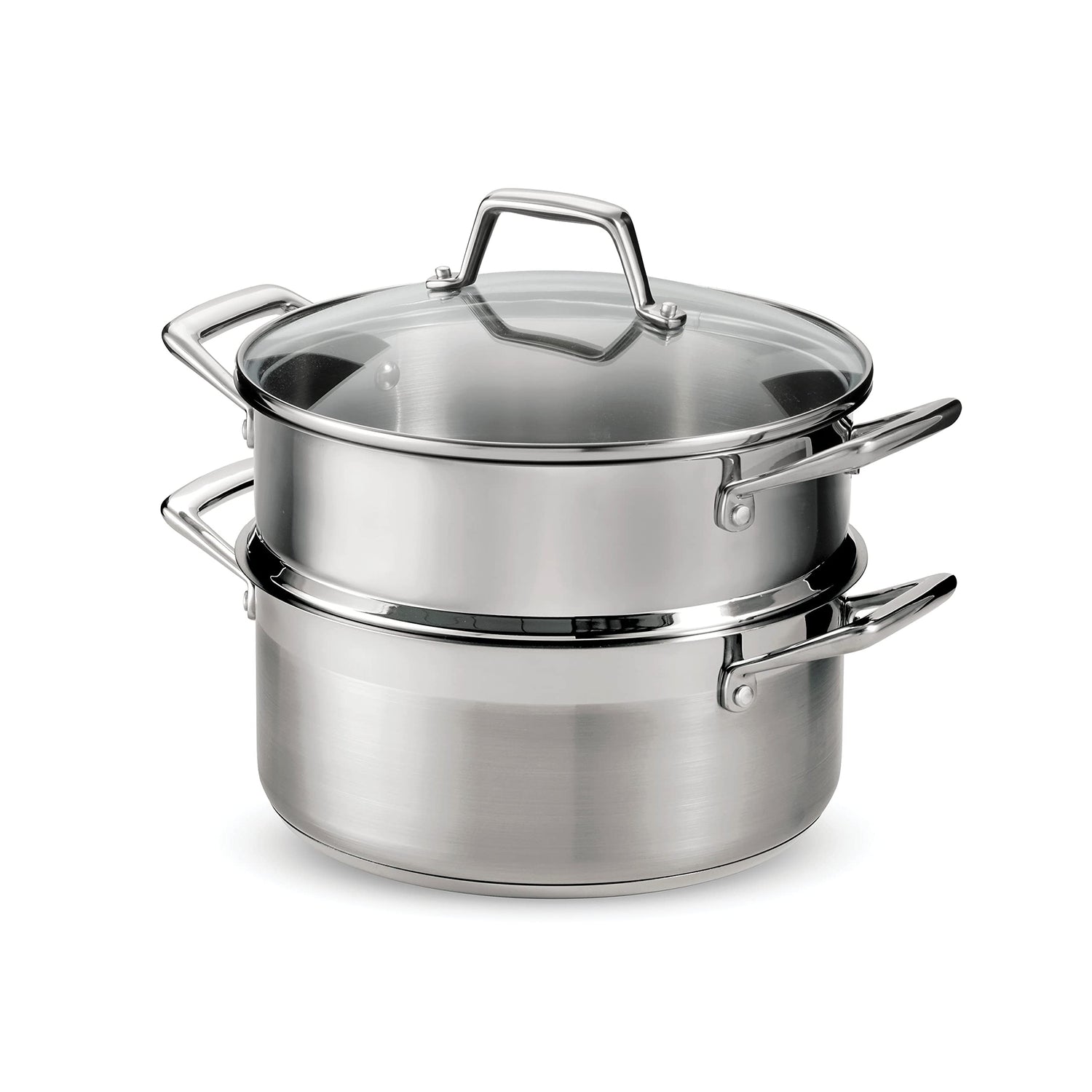 Details: Tramontina's 5 Qt. Stainless Steel Steamer Set is ideal for cooking proteins and steaming vegetables all at once! It can also be used for seafood, hearty soups, stews, and so much more! Its durable 18/8 stainless steel construction features an attractive, fine satin finish with mirror polished accents, with a tri-ply base, that provides quick and even heat distribution for exceptional cooking performance on induction, gas, electric, and ceramic glass cooktops. The ergonomically designed, riveted, cast stainless-steel handles provide added support when handling the cookware, while the heat- and shatter-resistant tempered glass lid is convenient for monitoring your cooking progress. This set is oven-safe up to 350 F (176 C), and dishwasher-safe for convenient clean up.