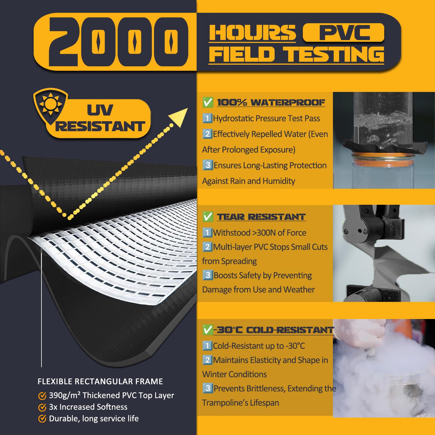 - âď¸ă UV-Resistant & Weatherproof Trampoline Pad for Long-Lasting UseăEngineered with 2000-hour UV resistance testing, this trampoline cover blocks harmful sun rays & repels water, ensuring year-round outdoor safety. The double-reinforced elastic straps securely wrap around trampoline poles & frames, preventing shifting during play. Ideal as a trampoline mat replacement 12 FT for backyard setups, schools, or recreational centers demanding fade-proof and waterproof protection.Weather resist!