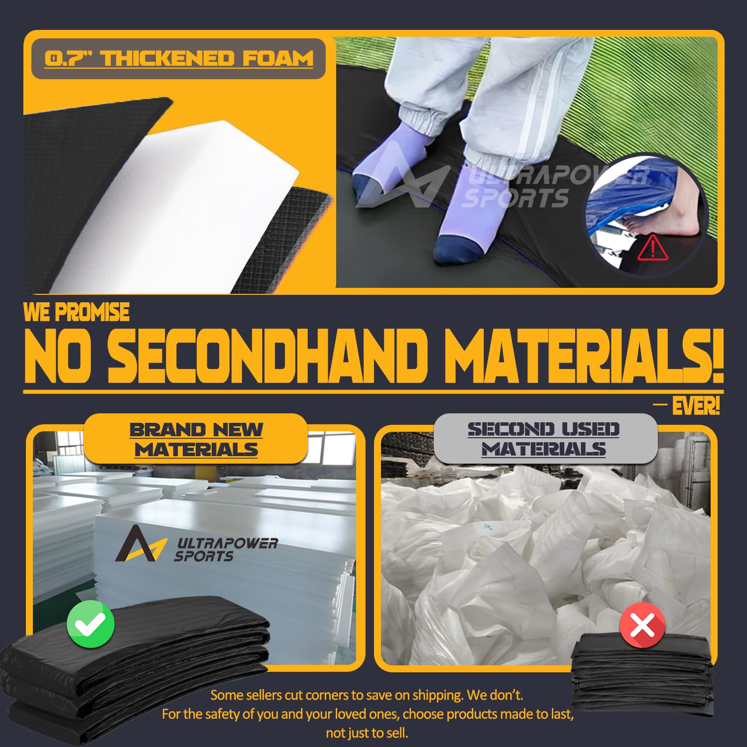 - đď¸ăTrusted Quality ULTRAPOWER SPORTS trampoline padă As a top-tier trampoline replacement mat brand, we prioritize safety and durability. We believe that you who appreciate quality will know how to choose wisely. The double industrial-grade stitching and triple-layer construction (PVC + PE + padding) outperform other flimsy covers. Whether replacing worn-out mats or upgrading old trampolines, choose our trampoline pad replacement that balances affordability with professional-grade performance.