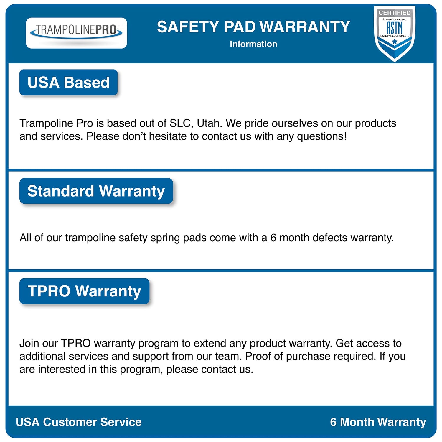 - MORE FEATURES: High Quality Shock Absorbent Tear Resistant Closed-Cell Foam Pad That Covers The Trampoline Springs and Will Not Absorb Water or Lose Shape Coating is UV and Cold Weather Crack-Resistant