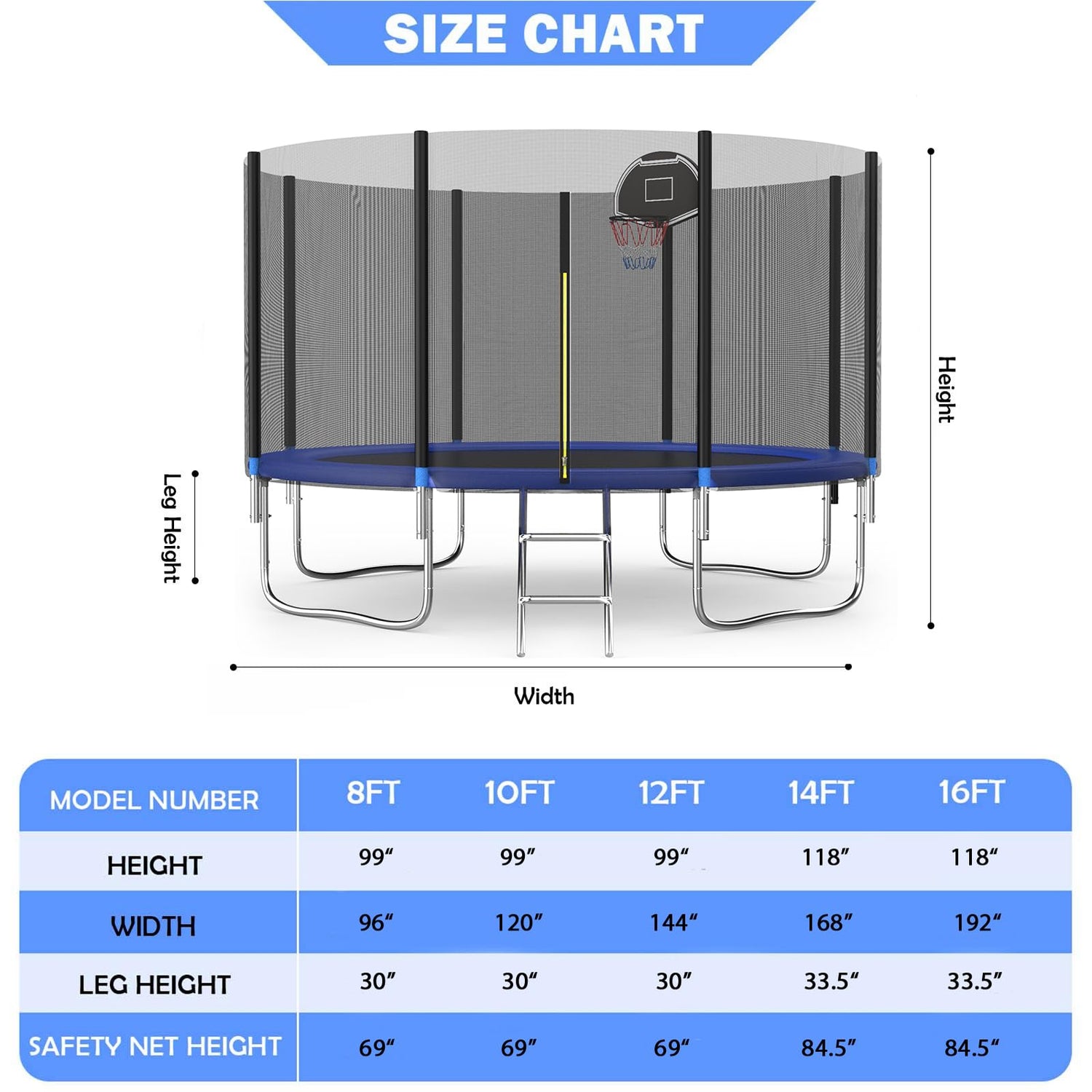 • Heavy Duty Frame and Accessories: 12 feet trampoline offers 4 large U-shaped legs and 1.2mm thickened tubes for more stability and safety. The trampoline with basket adds fun to your kids' jumping and allows you and your kids to have a carefree time!