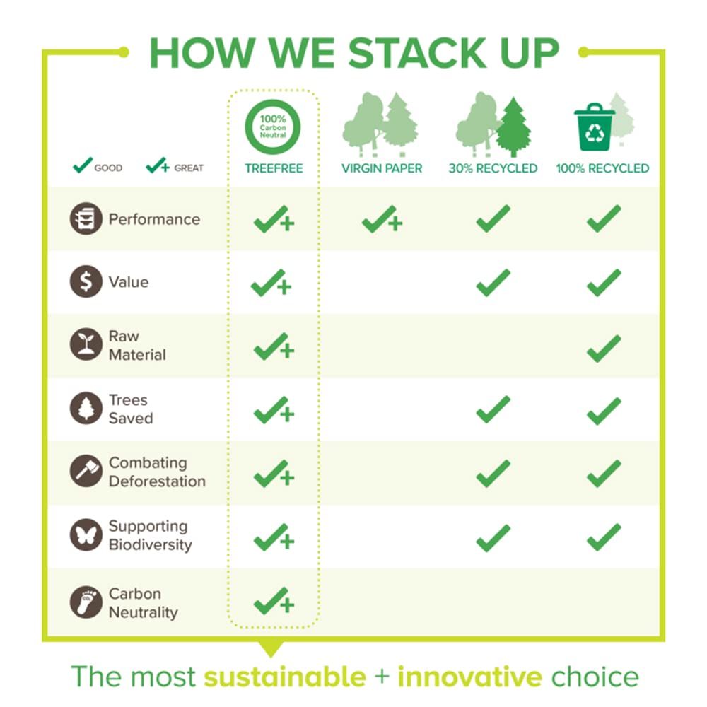 - ⭐ SUSTAINABLE. Treefree paper has a long-lasting commitment to the environment. Offsetting the CO2 generated from growing, manufacturing, distribution, and disposal of the paper is our sustainability as the core value.