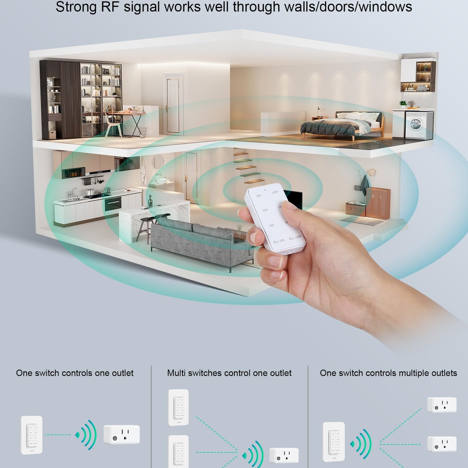 - 200 FT Control Range - Our remote outlet and switch kits work through doors and walls up to 200 feet, suitable for open areas such as bedrooms, living rooms, and garages, offering excellent performance and stability without interfering with other household appliances.