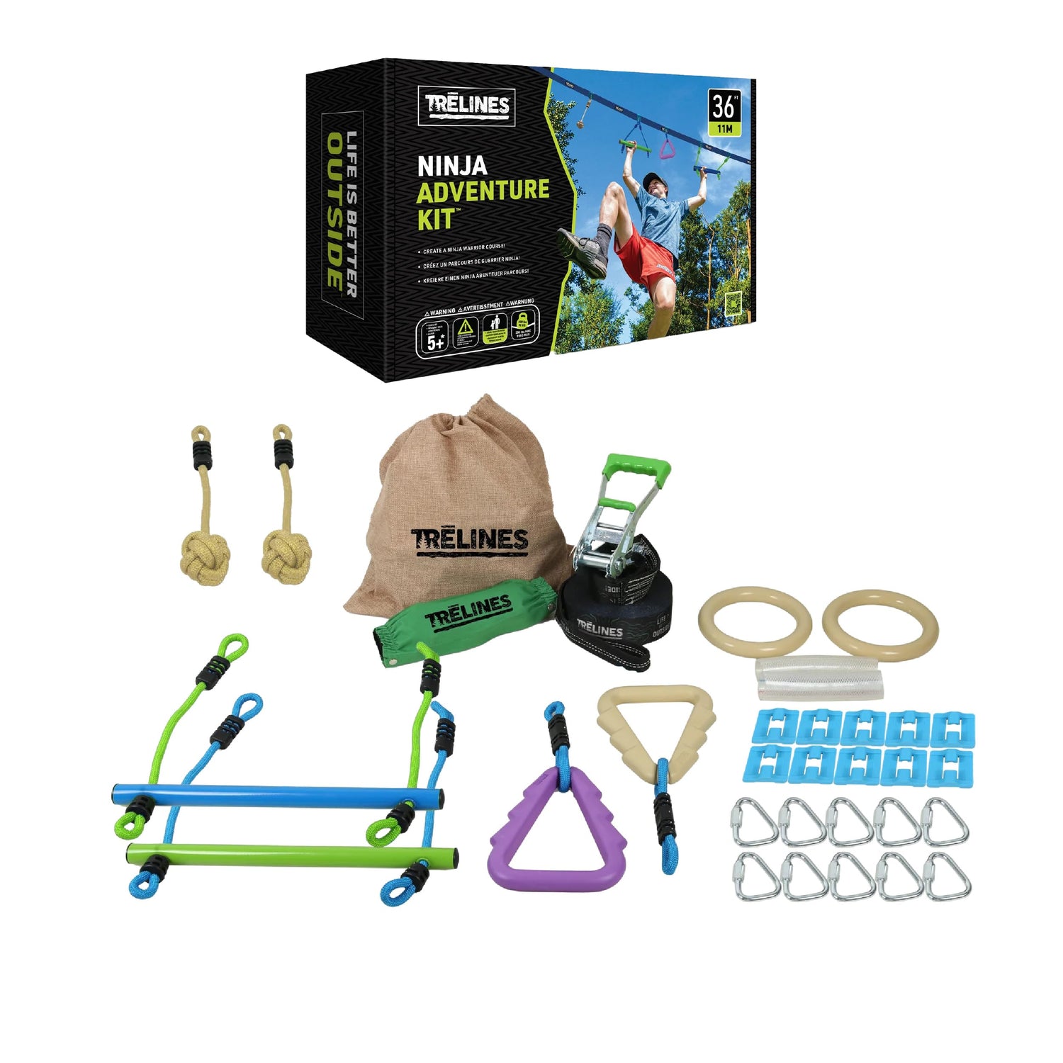 Details: PLAY LIKE A NINJA! The new Trelines Ninja Adventure Line is a super popular item for shorter Ninja course 30`(10M) or less. The kit contains: 36-feet Line and Ratchet, 2 Monkey Bars, 2 new Tree Gym Rings, 2 Monkey Fists and 2 Multi-Purpose Gym Rings, Ratchet Cover and Storage Bag, and 10 Treline Clips and Delta Carabiners.