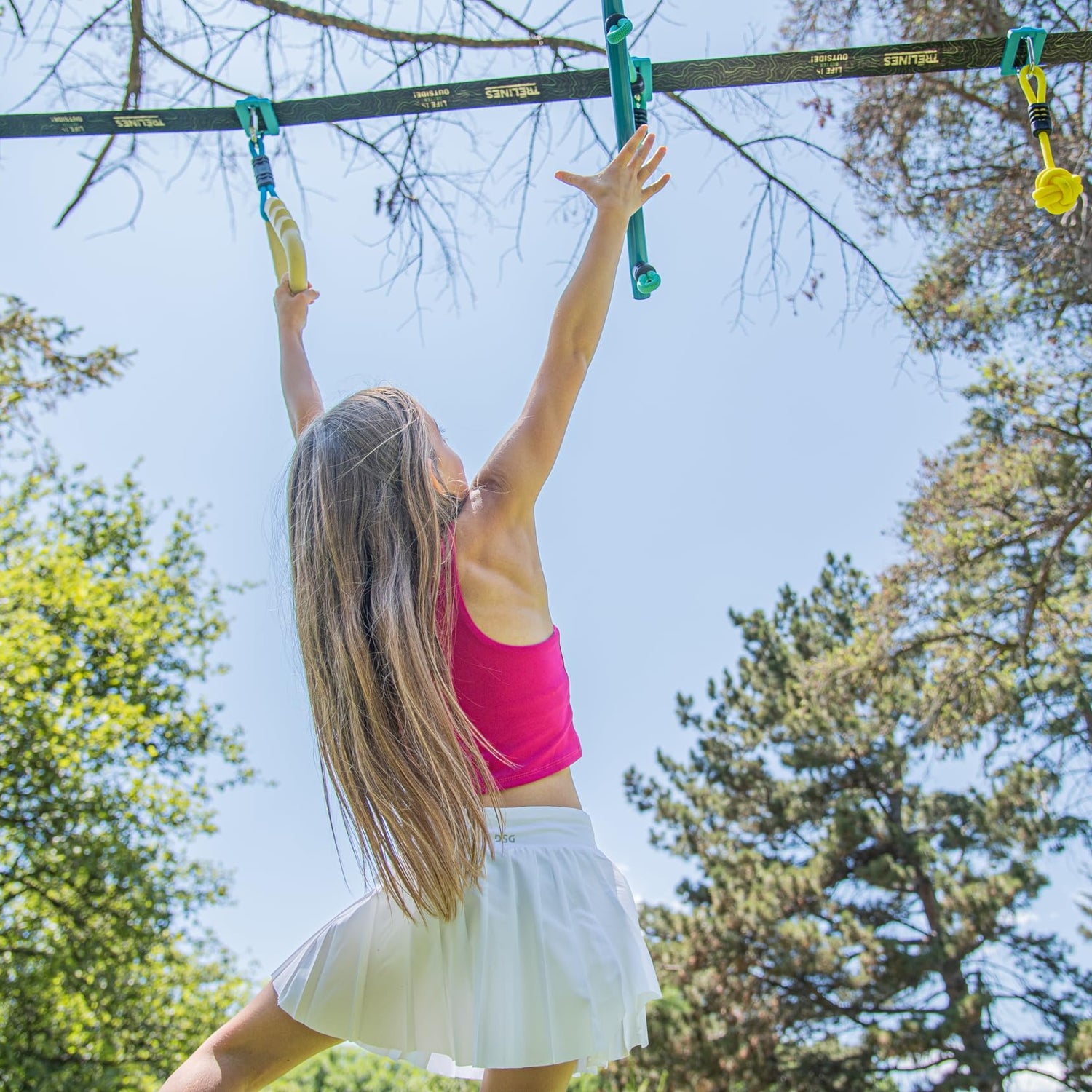 - KIT CONTAINS: Beautiful attractive Colorful 36’ Line, 8 Accessories: 2 Monkey Bars, 2 new Tree Holds, 2 Monkey Fists, 2 Gym Rings; Heavy-Duty Ratchet, Ratchet Cover; 8 Delta Carabiners & Line Clips, & Storage Bag.