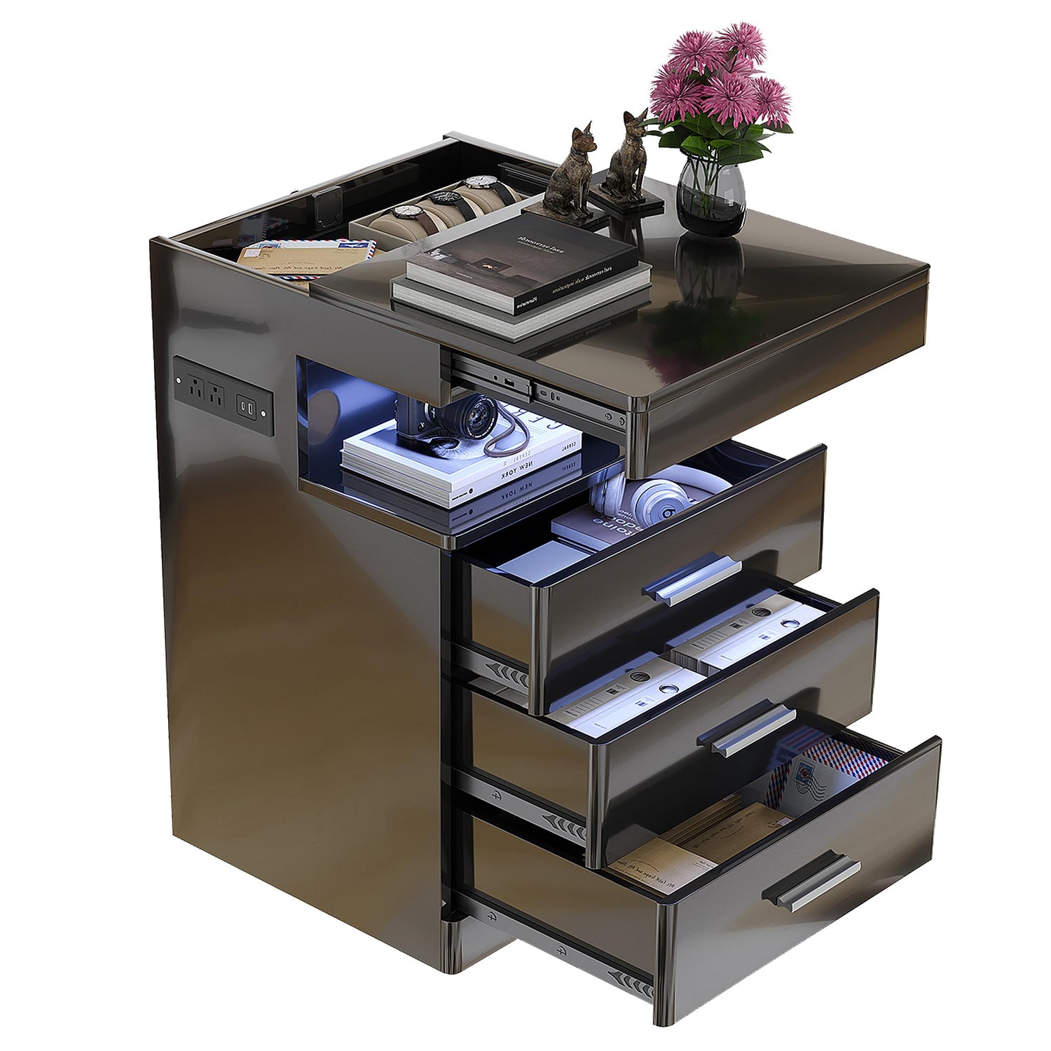 Treocho Led Nightstand with Hidden Space, Modern Night Stand with Charging Station, 3 Drawer Smart Nightstand with Glossy Finish, Tall Bedside Table with RGB Lights for Bedroom, Black
