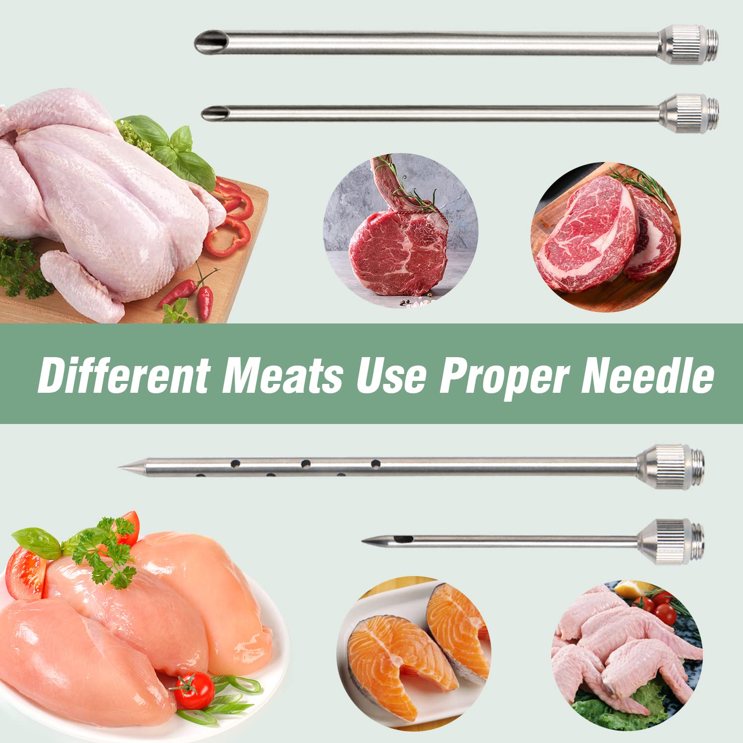 - Never Clogging Needle--food injector with 4 needles for different functions, especially the biggest needle, which specially designed to solve the blockage problem of large garlic granules and onion particles for injecting marinade into Turkey, Meat, Brisket, Brine and Chicken
