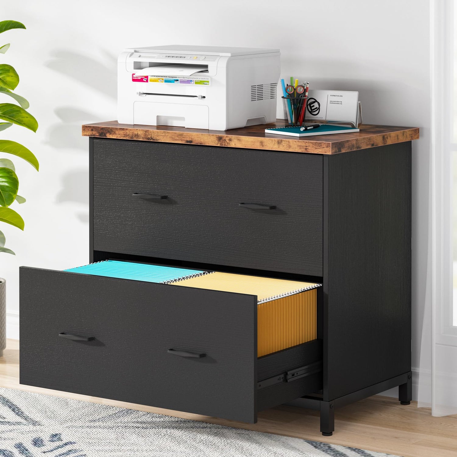 - FUNCTIONAL & STYLISH: To relieve your desk from piles of papers and you from the messy stress, this lateral file cabinet that oozes a charming rustic appeal and helps you say “bye” to chaos on the desk. Clean line design with a modern black outfit, will be a great choice for office, conference, home, college, etc.