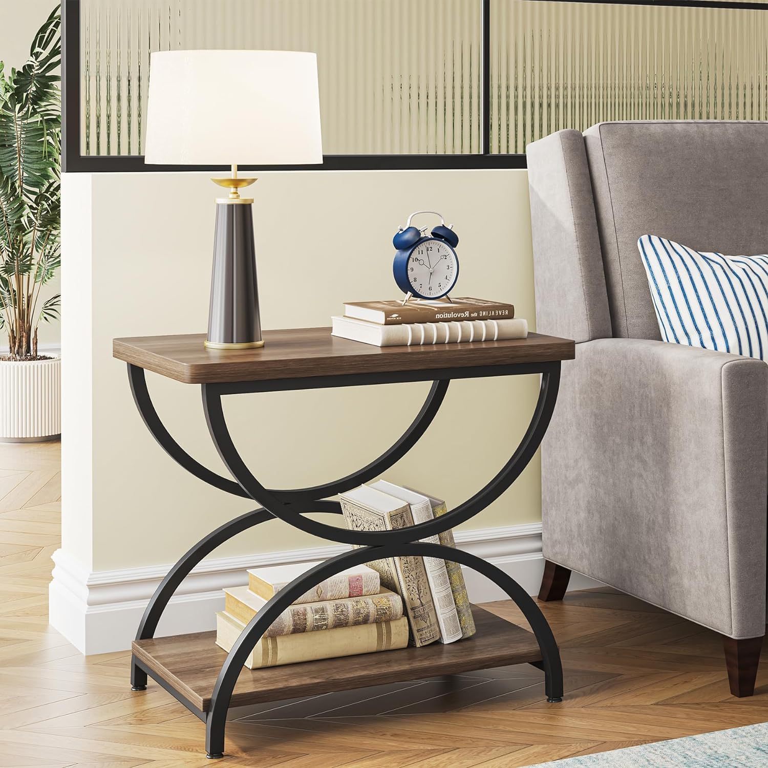 Tribesigns 2-Tier End Side Table with Stylish Metal Frame, Vintage Rectangular Bedside Nightstand for Bedroom, Wood and Metal Chair Side Tables Living Room (1, Brown Grey+Black)