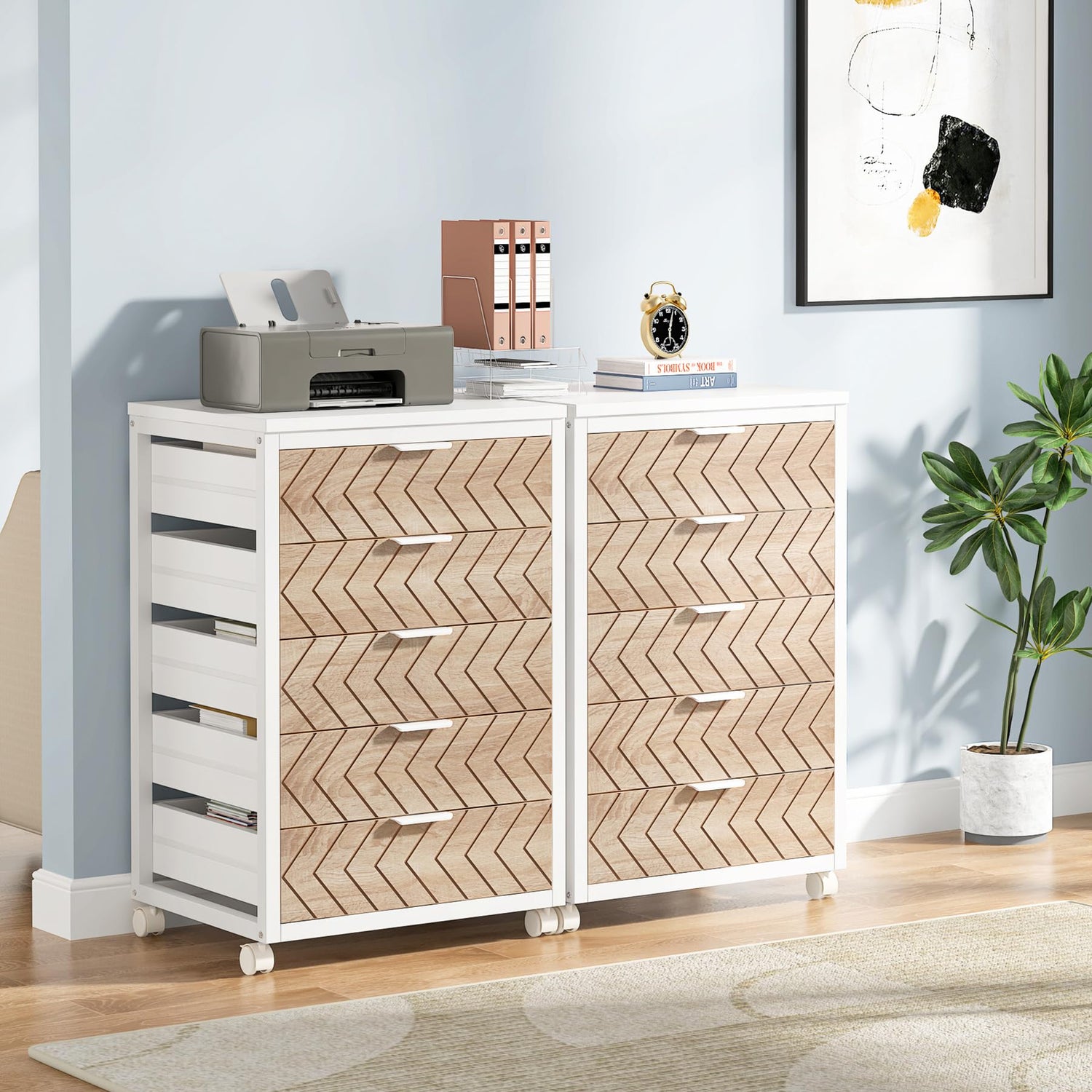 Tribesigns 5-Drawer File Cabinet, Wood Mobile Storage Drawer Unit, Industrial Office Cabinet with Drawers & Wheels, Rolling Printer Stand for Home Office (White & Beige)
