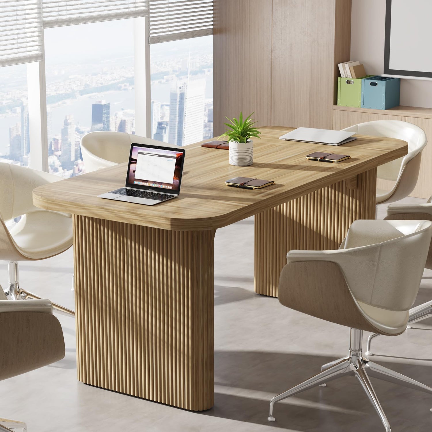 - Modern Minimalist Style: A true example of 'less is more', the wood meeting table embodies a modern minimalist design ethos. Its clean lines and uncluttered aesthetics make a subtle yet powerful statement. This elegant piece effortlessly adapts to any room décor, elevating the professional ambiance while retaining a warm and inviting aura.