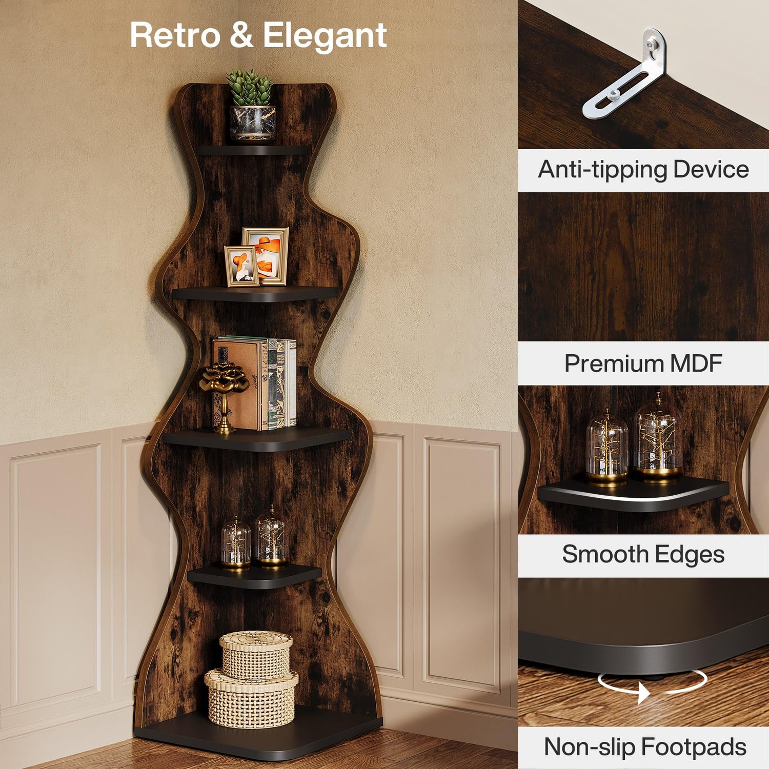 The Tribesigns Rustic 5-Tier Corner Shelf features a beautiful rustic brown and black finish that perfectly blends traditional and modern aesthetics. Its chic vintage appearance, combined with a streamlined design, will enhance the atmosphere of any room, making it a stylish addition to your living room, bedroom, home office, kitchen, hallway, balcony, or even bathroom.