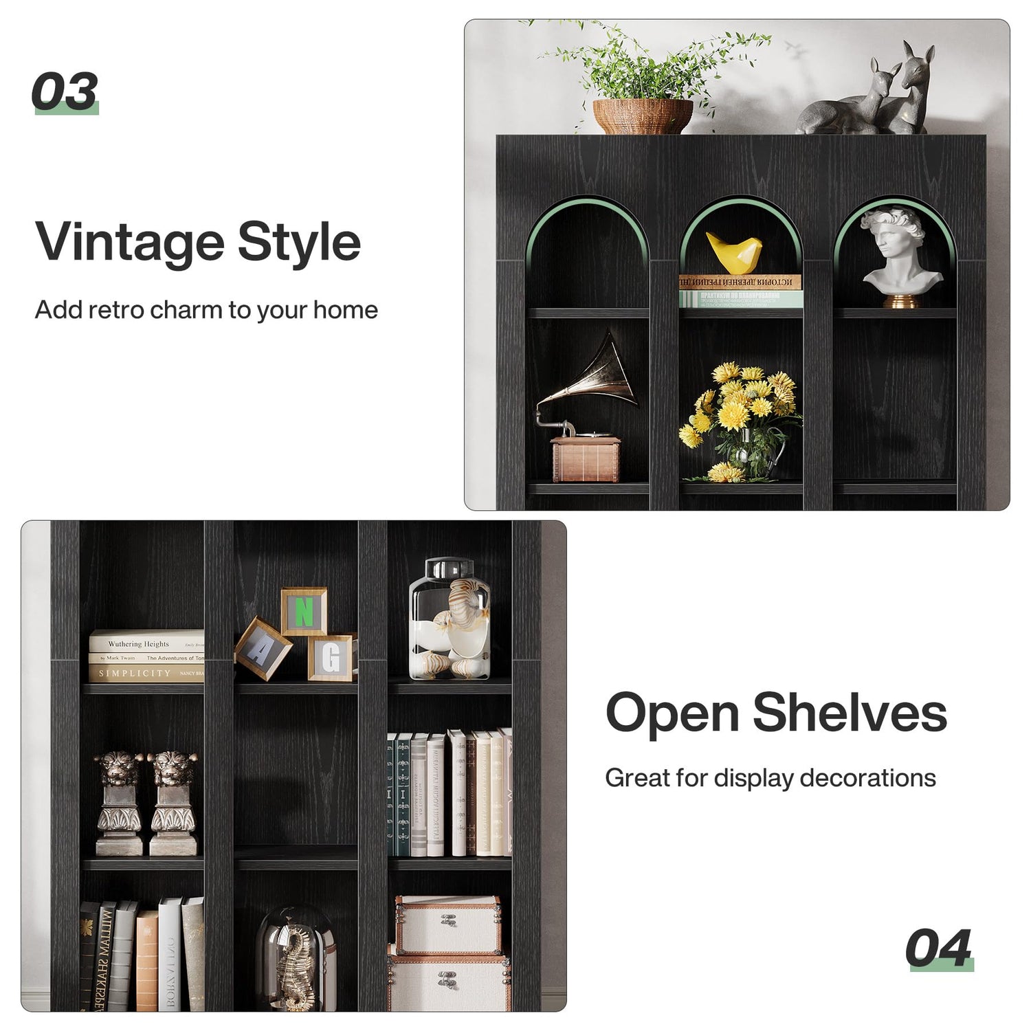 - Charming Vintage Design: Transform your space with the rustic farmhouse bookshelf that features a vintage black wood grain and arched detailing. It blends timeless charm with practical storage, adding a touch of mystery and elegance to any room